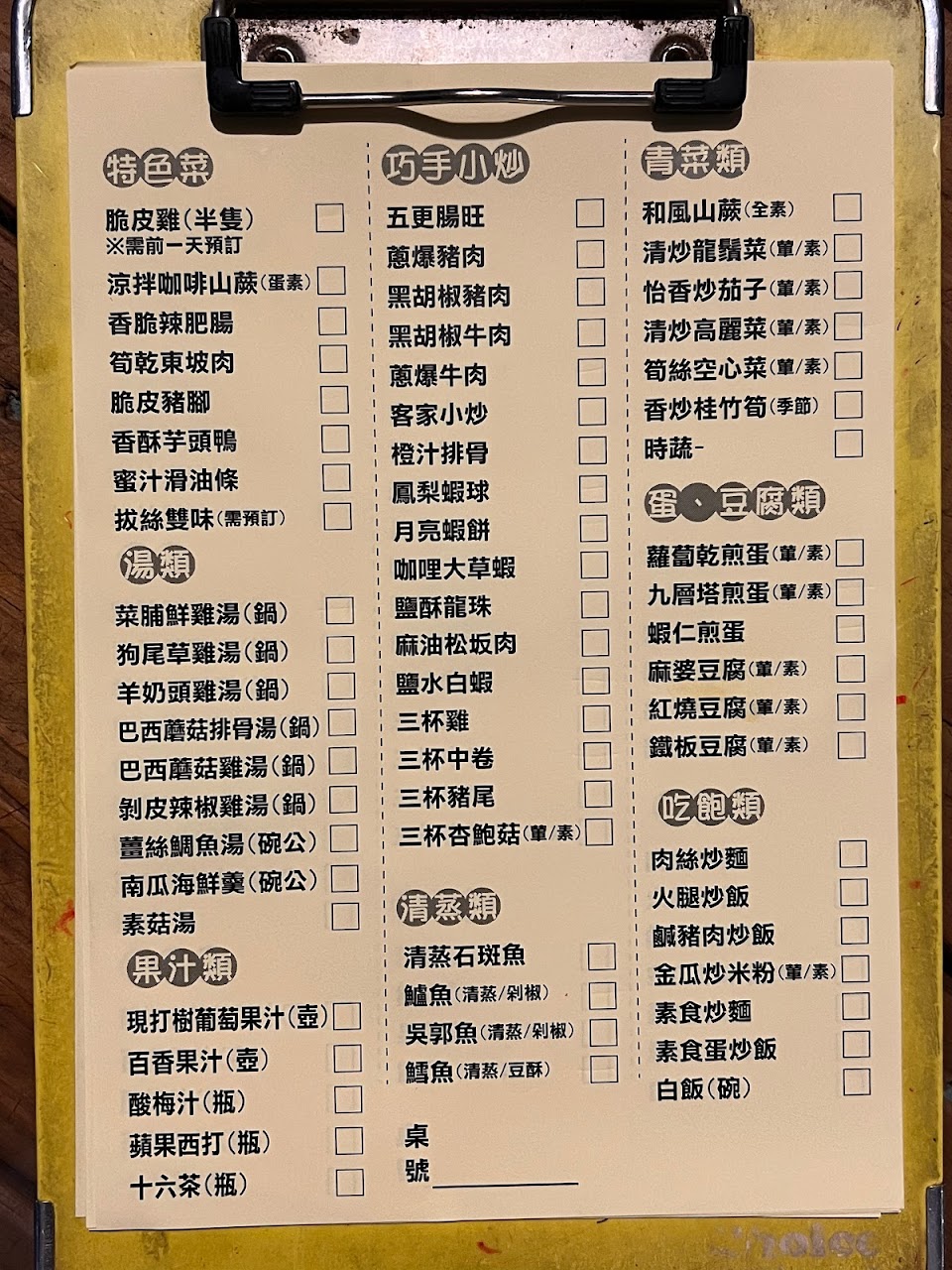 脆皮 雞 清蒸鱸魚 涼拌咖啡山蕨 橙汁排骨 南瓜海鮮羹 蘿蔔乾煎蛋 炒龍鬚菜 客家小炒