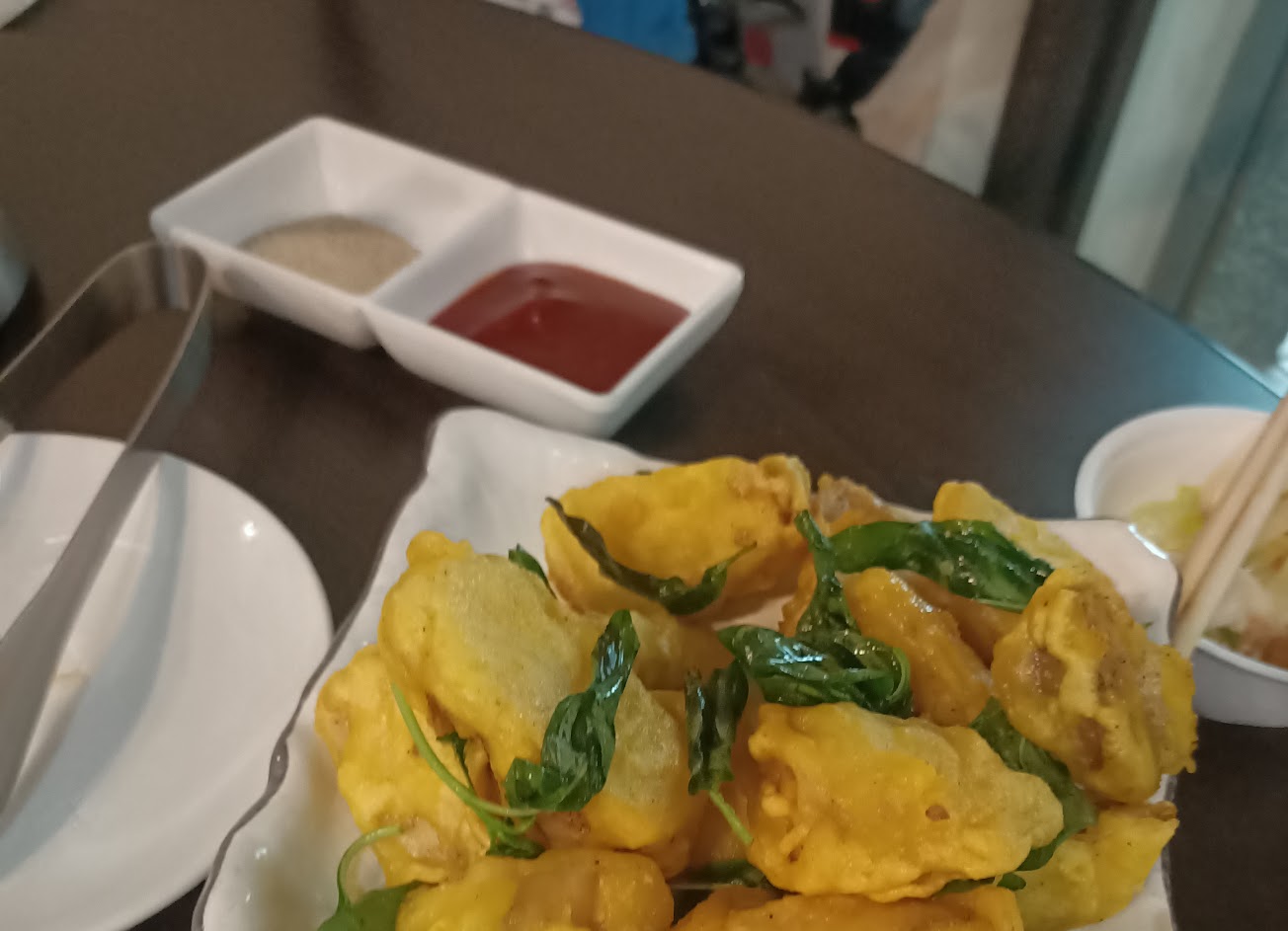 第一張地瓜是招待的,應該是桌桌有獎。豆酥蝦也是招待的,平日當月壽星憑證件招待一盤。