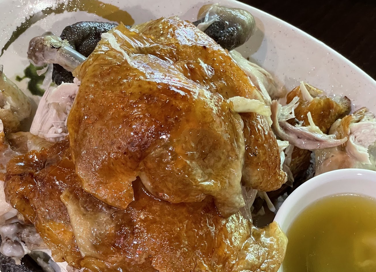 烤雞會先幫客人撕開,把雞骨拿去煮湯,湯頭味道更鮮甜。但也因為先撕開了,無法品嚐到第一時間雞肉流出湯汁的美味。一方面肉也稍微硬了些。