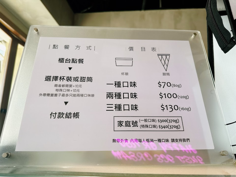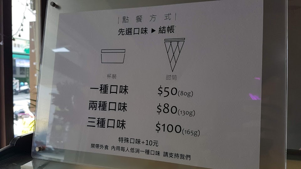 下雨天想外帶三球,店家表明盒裝三球無法提供蓋子,也無法另外用單球的盒子裝。 所以騎車、無法現吃的人只適合買兩球以下。 冰淇淋不會結冰霜,口感還不錯,一球50、兩球80、三球100元,捲桶餅乾10元。