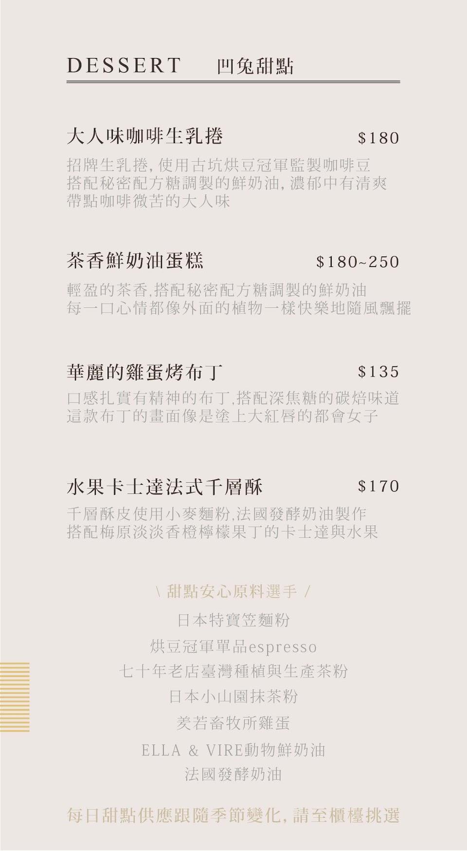 內用成人低消為一杯飲品,特別的是還有販賣調酒,甜點則是以當天提供的為準。