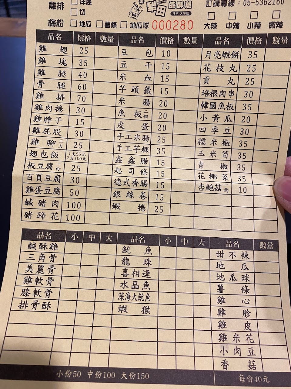 今天在地人第一次去位在禮拜六夜市附近的鹽酥雞、人還挺多的、但是,失望質很高!點了薯條、鹽酥雞、米腸、還有白魷魚、四樣160??而且炸起來不知道是油味還是某個調味粉的味。吃了一口完全不可以,吃了一口米腸,好乾啊。吃了ㄧˋ口鹽酥雞,是麵粉多了點,有一種不是調味的感覺也不是食物本身的味道。說不出哪裡怪但是也是最後一次了!不值得? …