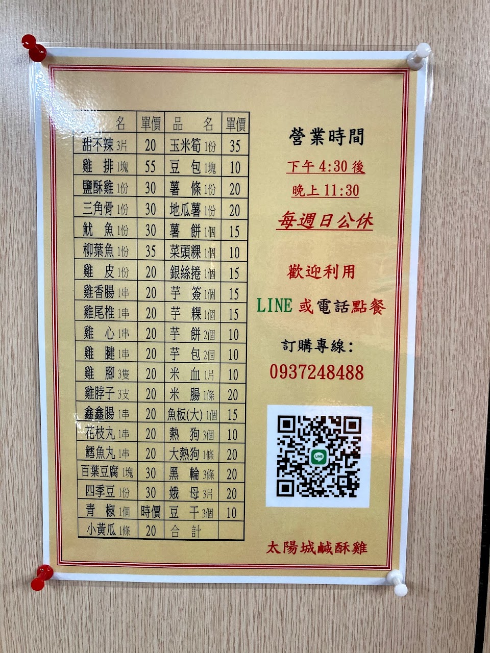 2024最新在地推薦餐廳的菜單_太陽城鹹酥雞-斗六成功莊敬路口的菜單、圖片