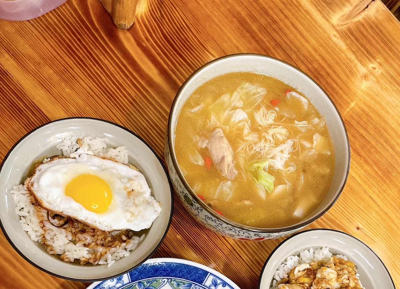 燒肉飯和醬油蛋飯都很有味道,滷汁完全不一樣,吃得出很用心製作。推薦香菜豆包,敢吃香菜的人請一定要點一份,煎得香酥的豆包,裡面夾了滿滿的香菜,味道絕妙!燙青菜的調味除了有醬油膏的鹹味,還帶了點難以形容的清甜味,值得一試的用餐好去處。店裡佈置也很懷舊喔!
