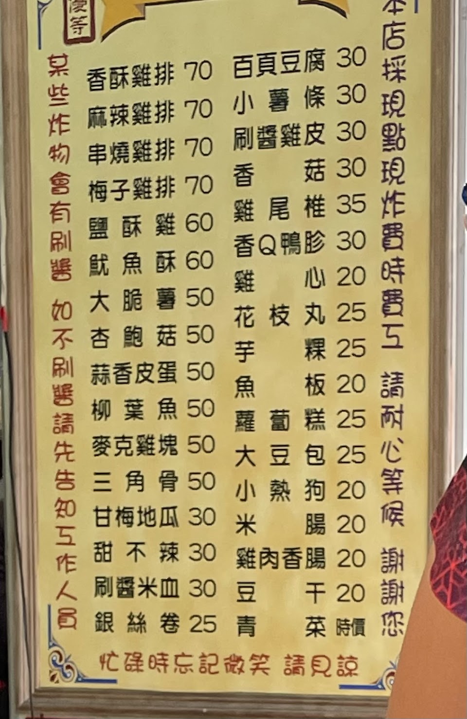 價格好像調漲了,但就份量而言其實算合理。味道不會太油太鹹。三角骨肉質太乾硬,炸過頭或油溫過高?