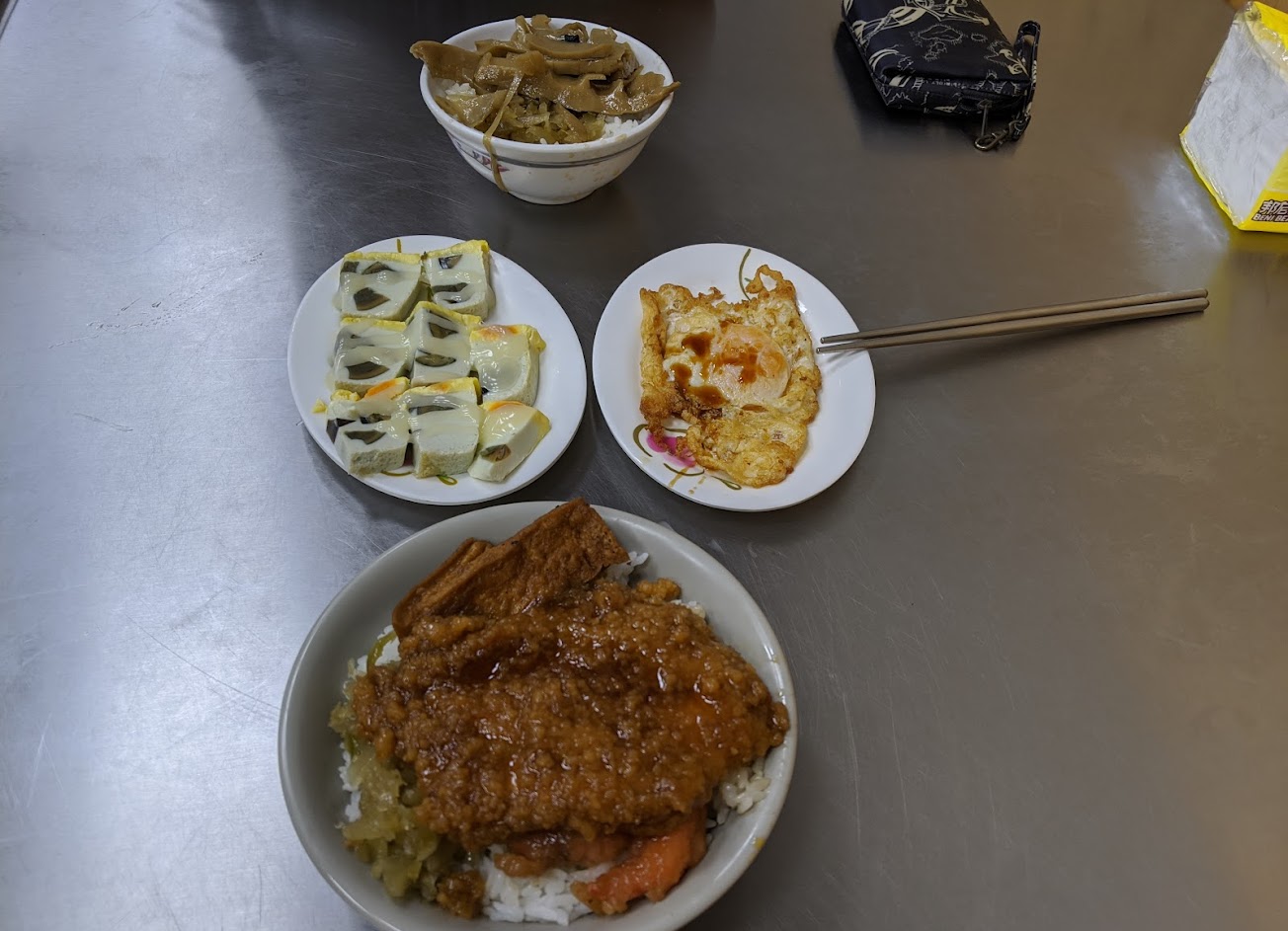 自從被報導過後爆滿人 冷氣感覺沒什麼功用 煎蛋如果像台中一樣用麻油就有做到精髓可惜沒有不過15元不要太計較 飯太軟爛了 (快變成粥了) 海陸的蝦子只有四個 排骨跟豬腳都很軟爛 單點排骨飯還可以 草魚湯很鮮甜,上面一片魚?