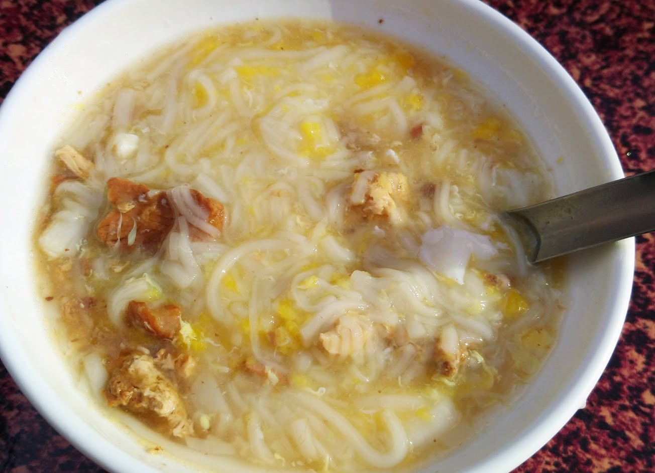 北港麵線糊 ,比飯碗大一點點。 白色的麵線,咖啡色的是瘦肉燥,黃色的是蛋 。 看起來很清,但味道還不錯。