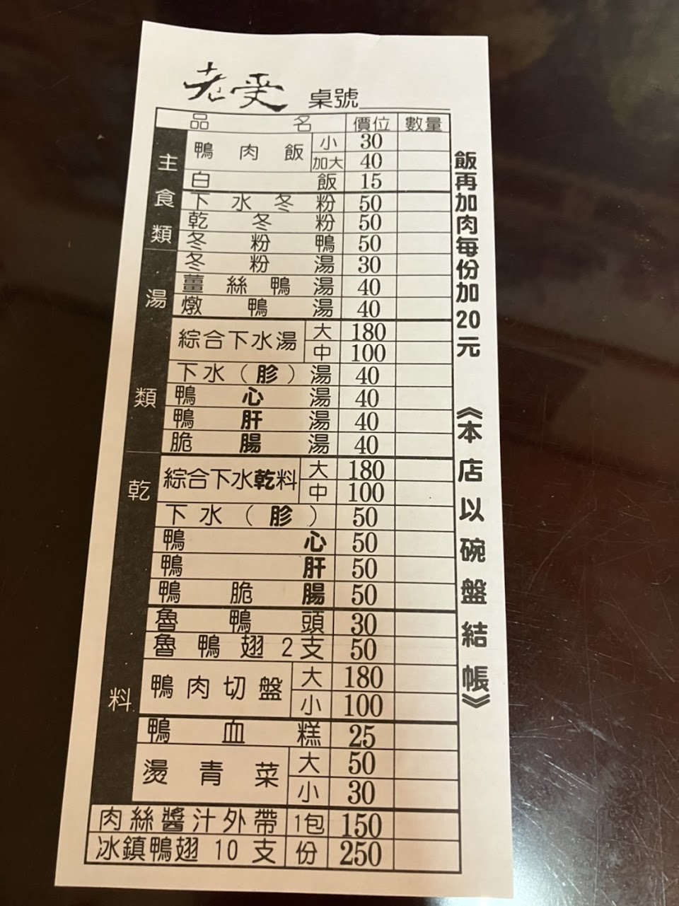聽在地人推薦,一間福什麼和這間老受,剛好都在北港朝天宮的正面對老街上,兩家也都在斜對面而已,這間吃起來可能是住北部的關係,覺得鴨肉切盤實在是太太太划算了,來這裡一定要吃保證不後悔;相較於鴨肉和價位的CP值,鴨肉飯和湯品我覺得表現就沒這麼亮眼了,鴨肉飯中規中果覺得還不錯吃,但湯品就比較死鹹沒有特別的感覺,如果第一次來吃就建議鴨肉飯搭配鴨肉切盤嘗鮮即可,除非人多才點多一點。
