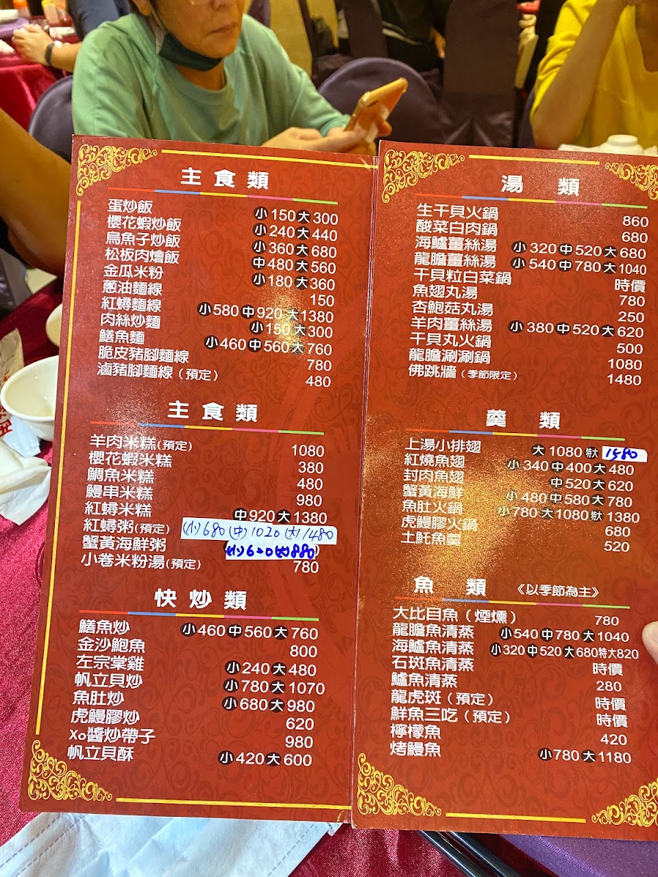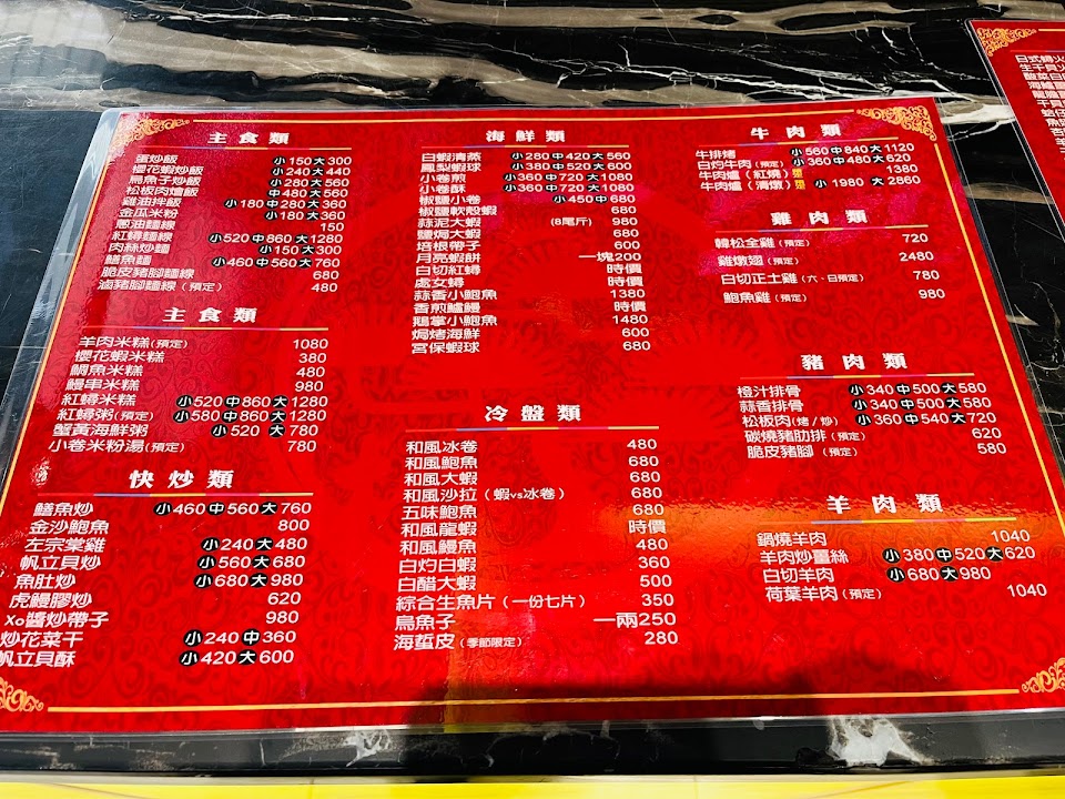 紅蟳米糕 綜合生魚片 干貝蟹黃海鮮粥 魚翅羹 牛排 松板豬