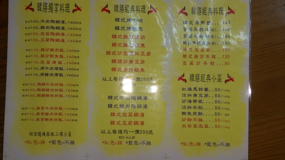 料理口味中等以上,應該有改良過比較適合台灣人的口味,餐具也很韓國式。缺點是店內空間真的很小,木頭式餐桌椅子,所以很硬,不適合久坐。飲料是自助式的白開水跟無糖麥茶。價格小貴份量少,經濟餐的三種小菜,都真的很小,像辣甜不辣只有兩條? …