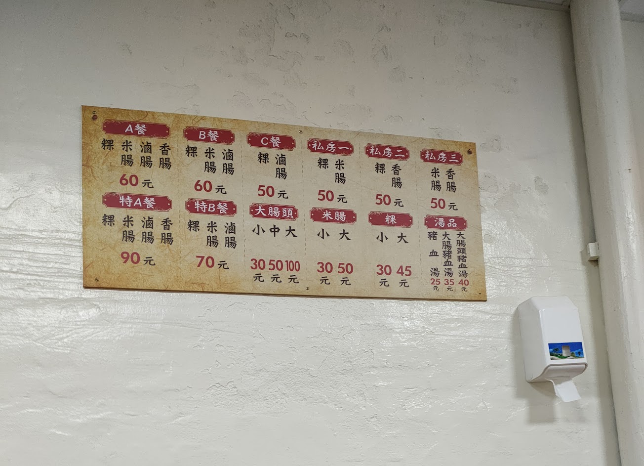 誤打誤撞的來,本來路過看到熟悉的招牌,心想是不是曾經在美食節目上看到,一查果真如此,點了B餐,粿(用在來米做的)+滷腸+米腸,份量適中,上頭淋上獨門醬汁,每一桌都有辣醬跟蒜泥,個人覺得要加蒜泥更對味,也覺得粿如果可以煎恰恰可能會更好吃(應該是可以跟要求),門口有一桶,一開始裝的時候以為是熱茶(似乎也沒寫?),所以我就盛了一碗想說放涼再喝,等我全部吃完後,去喝時發現,怎麼是柴魚高湯!!!! 早知道多喝幾碗???? …
