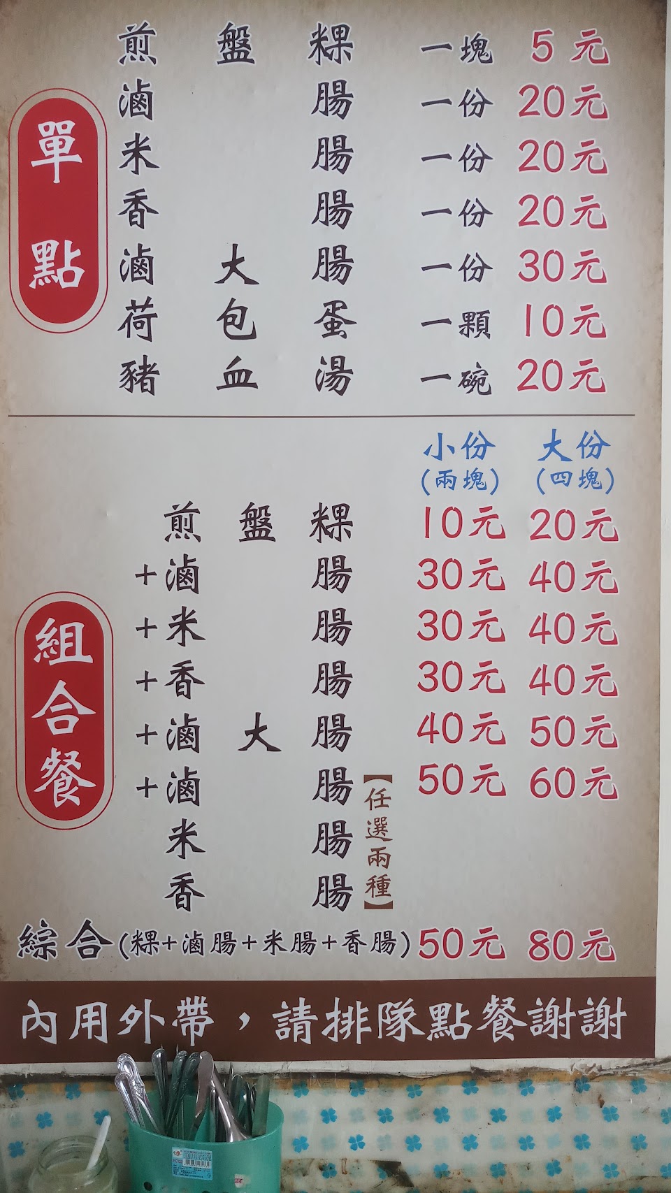 可以單點也可以選擇綜合 綜合包含 粿、小腸、米腸和香腸 最後淋上醬油和白甜醬 小綜合每碗50 大綜合每碗80 店家還提供免費的柴魚清湯 愛吃辣的可以加些辣醬更美味
