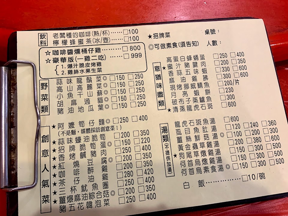 咖啡桶仔雞要提前預約,沒訂所以沒吃到? 咖啡醉雞好吃有特色,底下還有泡菜,晚餐還點了竹筍、九尾草雞湯、鹹豬肉、苦茶油雞、炒山蘇,都還不錯吃。 生意很好,建議提前訂位,寵物友善。 服務 內用 餐點類型 晚餐