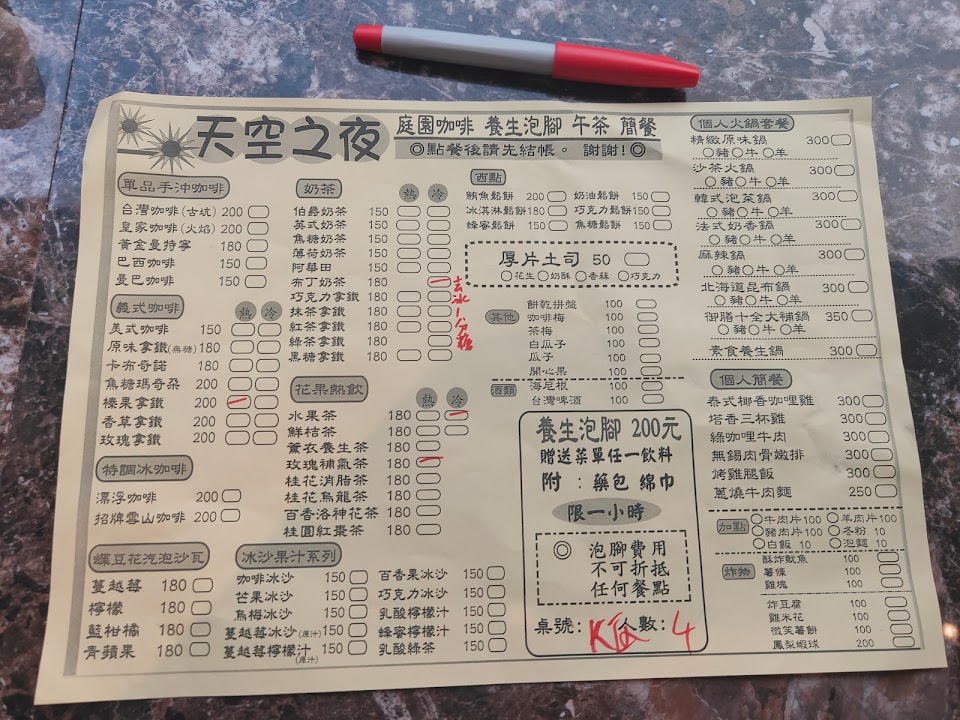 進去之後,要先去櫃檯拿點菜單,然後自己去找喜歡的座位,選完座位點完餐再自己拿下去櫃檯結帳,一段時間後餐點就會上來了,而在等待的這段時間內,會建議可以到園區裡面走走拍拍照,因為園區內有超多網美景點可以讓你拍出美美的照片,拍完照之後餐點也已經送上來了,就可以一邊泡腳,一邊欣賞風景或夜景,一邊享受餐點和飲料囉,個人覺得這裡,和嘉義的泡腳咖啡比起來,這裡的cp值高多了,餐點也比較好吃,價位也比嘉義便宜一點點,是我會再帶朋友來的泡腳咖啡唷,還沒有來過的朋友,來雲林玩一定要來嘗試看看,呵呵??? 服務 內用 餐點類型 晚餐 平均每人消費金額 $400-600 餐點:5 服務:5 氣氛:5 建議的餐點 原味火鍋