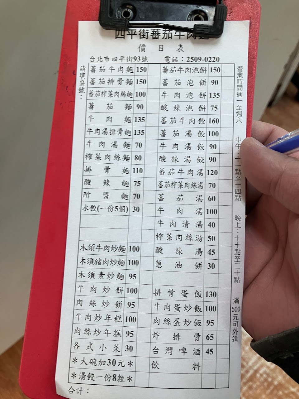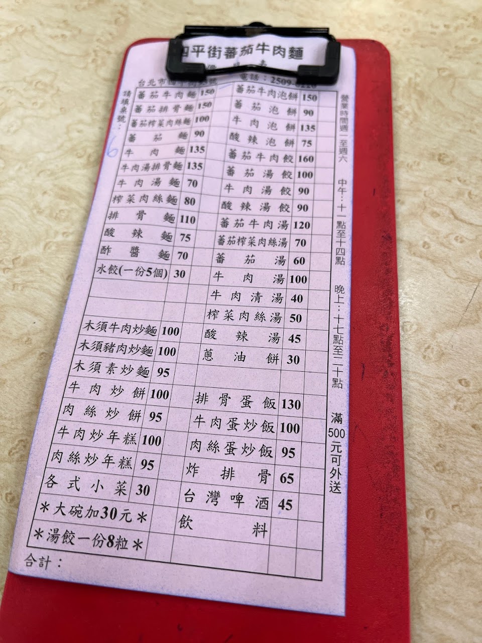 下午5點開始營業,我5:10進店時,已是第8位客人了,點了蕃茄牛肉麵,湯頭夠味,很有蕃茄味,牛肉有口感,刀削麵有嚼勁,一碗150元,cp值不錯,看菜單上還有炒餅,下次來吃,現在很少有這道了,