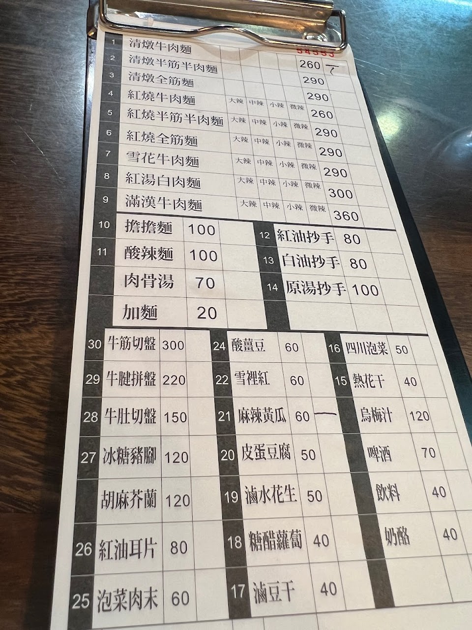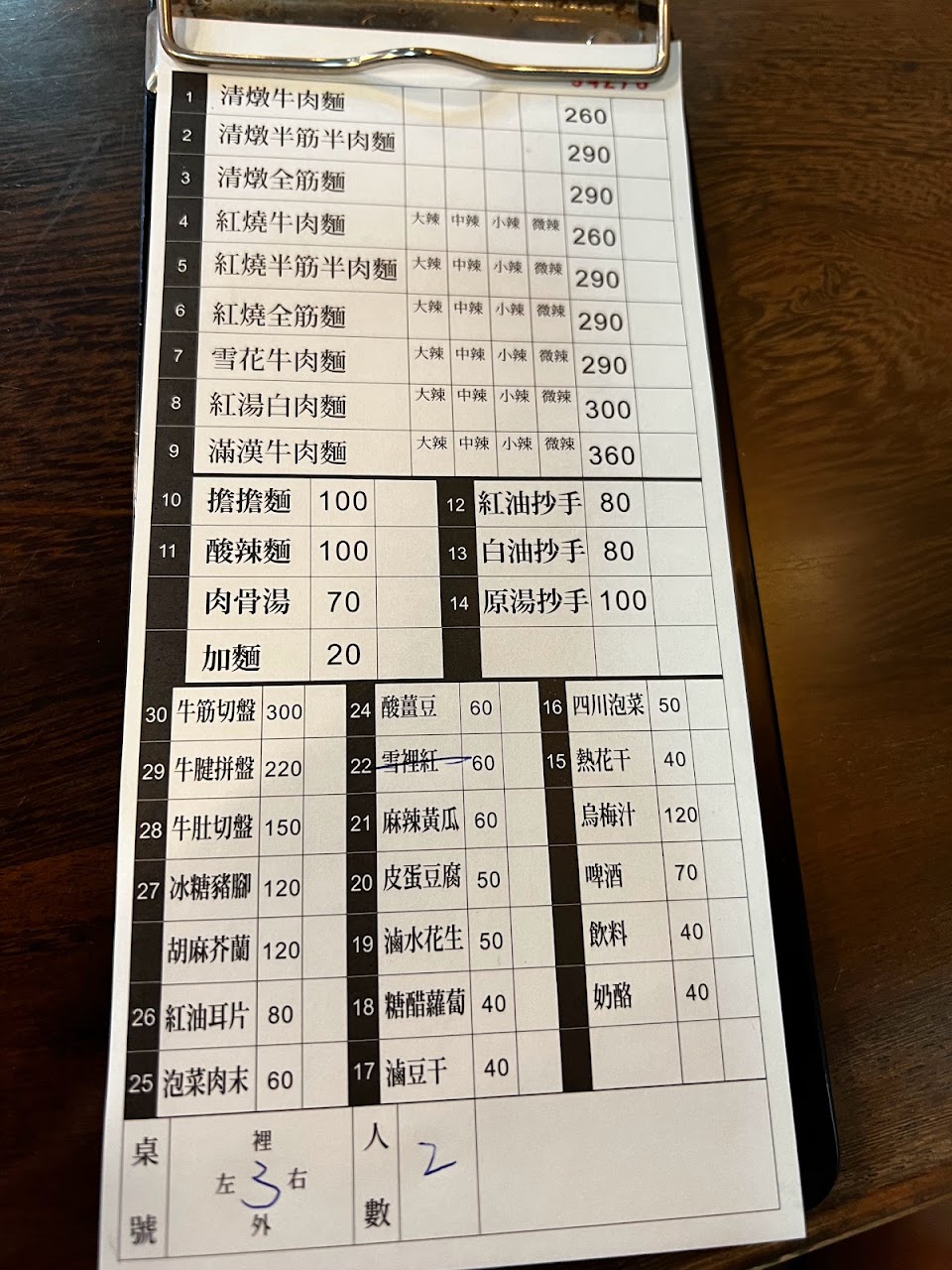 環境90分,裝潢漂亮,但位子不多也差不多20幾張椅子,常要和別人併桌,肉95分,麵條85分,價格70分。除了價格較高外,我挑不出任何毛病。前面有人講到中原街廖家。我真得覺得很好笑。那間就路邊攤的風格,也沒幾張座位,對於一定收入以上的人來說,那種用餐環境真得差。有的人吃東西難道就是一直cp值高,肉大塊,麵多,然後最好是價格只是原來的一半,他就覺得很爽了嗎?說實在話,我還真得不希望在店裡遇到這種人。用餐也是得講究用餐環境的好嗎?前面也有人在比林東芳,林東芳就是標準的路邊攤風格,還用大鍋鐵桶在那裡煮。我第1次去吃也是傻眼,但還是吃了。是差不多19年以後才在附近開了新的店面,難道那種用餐環境還有人覺得很好?不求精緻路線,一輩子就吃得粗飽就行?2021年又再來吃,發覺白切牛肉盤的口感沒有以前嫩了。減1顆星。