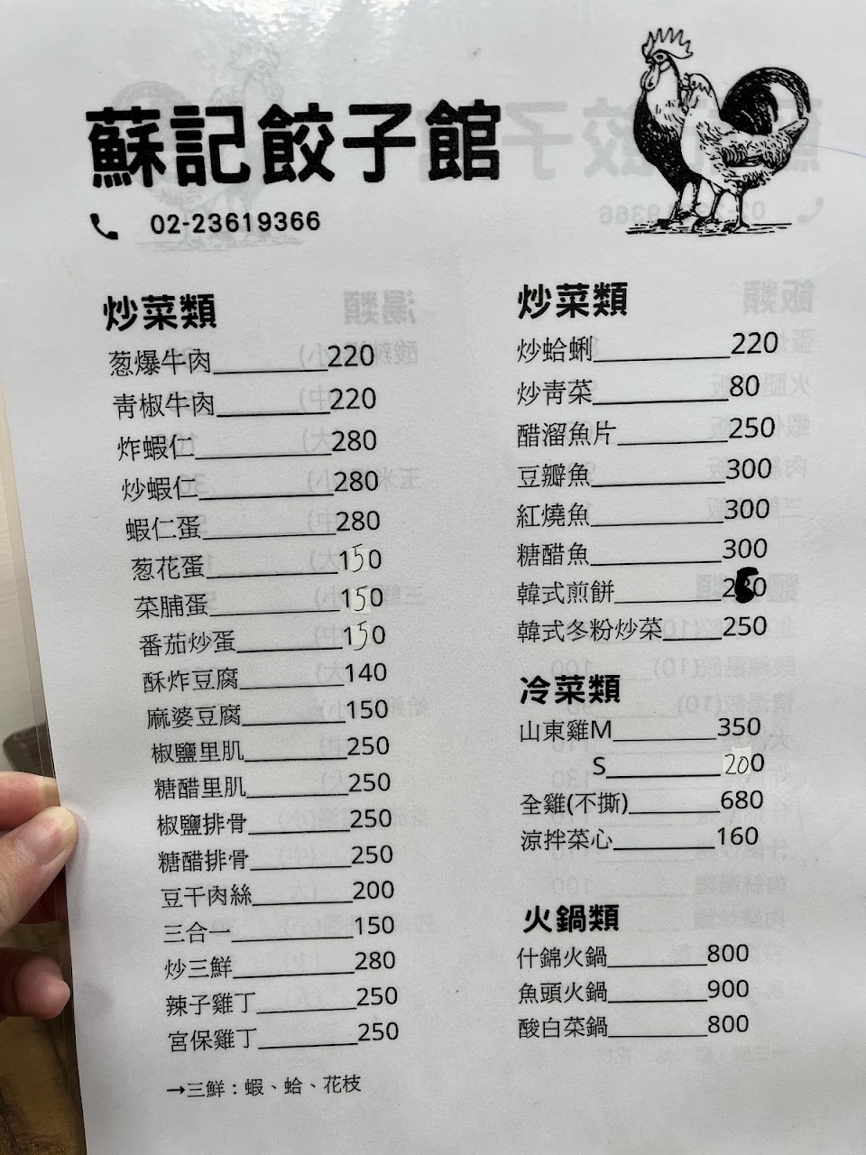 二面的菜單滿滿的各種菜餚,價位平易近人:點了山東燒雞、韭菜水餃,蛤蜊湯!