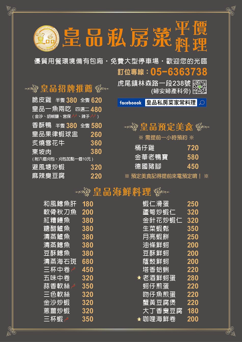 筍乾爌肉 蚵仔酥 麻油松阪豬 蟹黃豆腐煲 蔥爆牛肉 蛤蜊湯 四季肥腸 麻辣水煮黃魚 苦瓜炒牛肉片 豆鮮l蚵