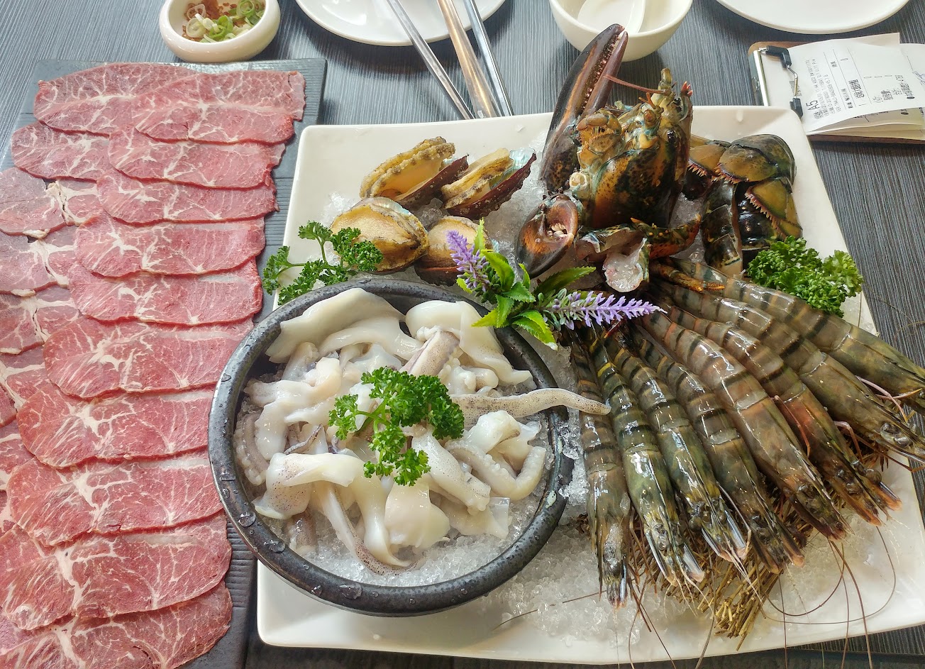開幕(價位5仟多):波士頓龍蝦3隻、泰國蝦20尾以上、沙公或沙母3隻、牛肉豬肉片是堆三層各至少30卷、石斑魚、香腸10條⋯