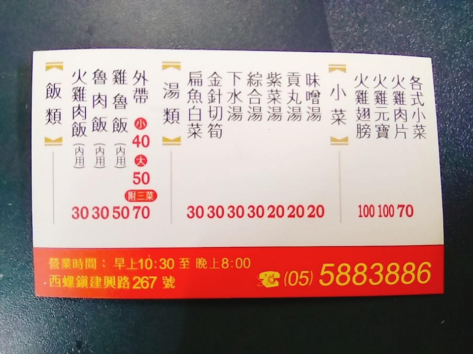 火力雞西螺旗艦店是連鎖的火雞肉飯小吃便當店,嘉義、雲林斗六都有分店。店内當然主打是火雞肉飯了。若不是買便當的話(可選菜),其它小菜採單點方式,價格略高。