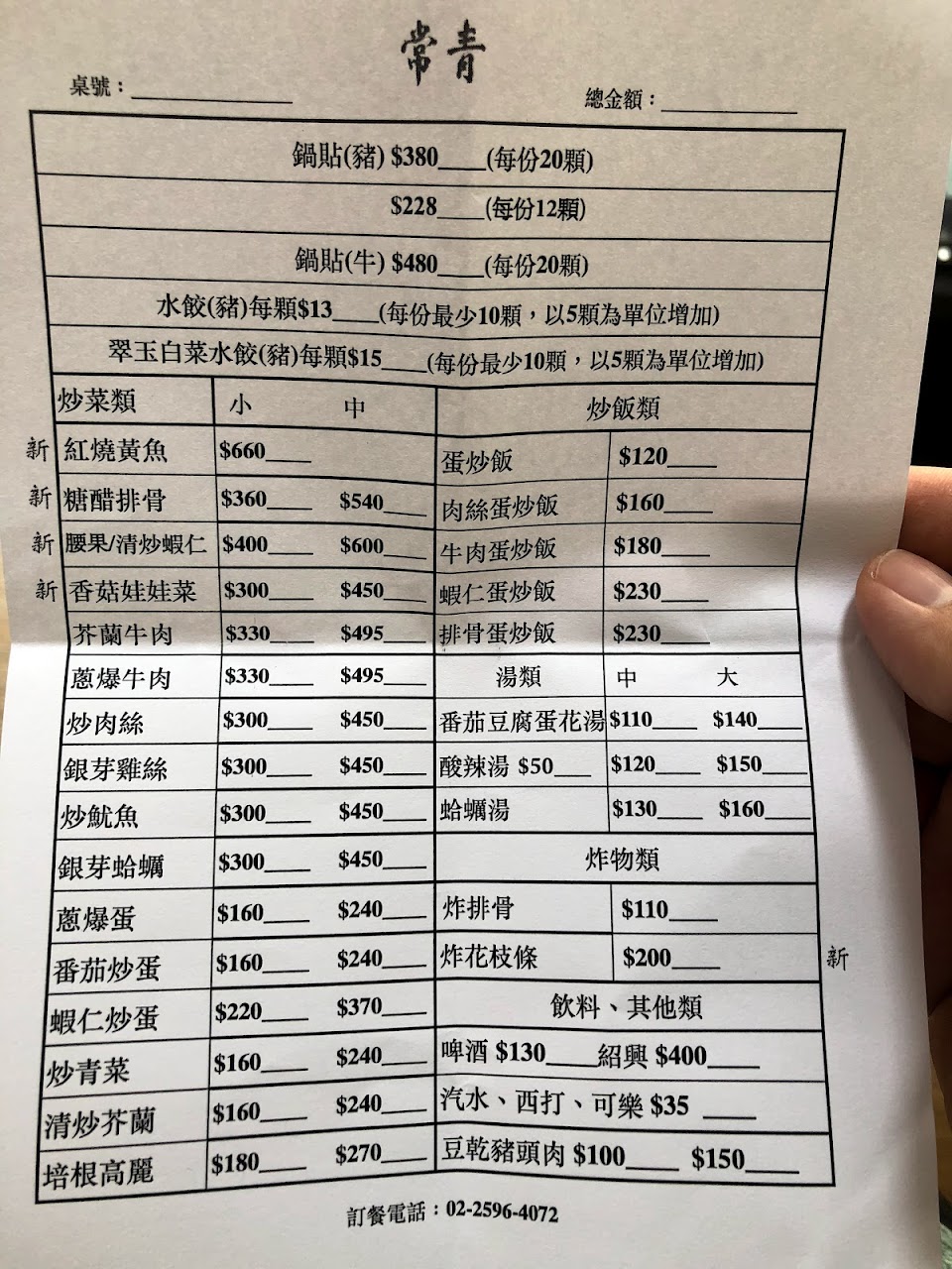 @用餐日期:2018/01/13,晚餐 @用餐人數:2人 @點餐:12顆煎餃(炸水餃),肉絲蛋炒飯,酸辣湯,共 $438。 1、漏單,等了20分鐘餐點沒來,前去尋問發現漏單。 2、煎餃,是炸餃子,店附近的農安街老牌山東餃子也有。常青的炸餃子,內餡有點韭菜。小油,不過滿好吃的,一顆$19元,一盤12顆,小貴。 3、酸辣湯很小碗,鹹,$50。 4、肉絲炒飯不錯。