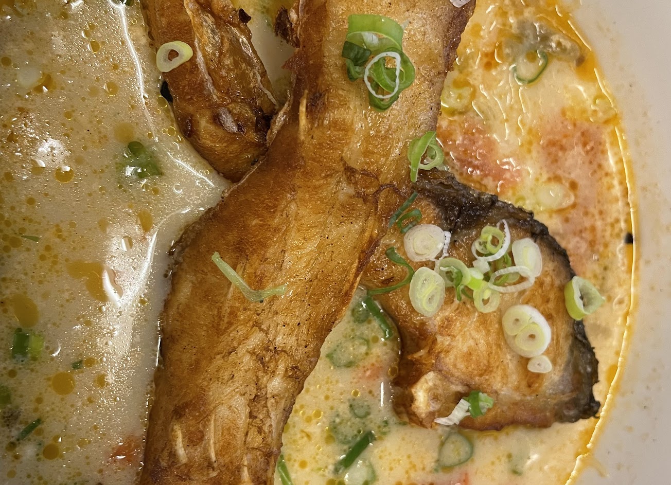 3. 主食部分,椰漿飯椰漿味夠濃,但飯粒偏濕較軟,口感不足,炸雞&辣醬正常發揮,反而驚喜的是配菜炒豆角?;魚頭米粉是全餐最好吃的一道,三塊大大的炸魚,肉多炸得剛剛好,香濃乳白的魚湯,很好喝,米粉吸滿湯也好好吃,不過限定週五到週日才有,有機會大家可以試試看??