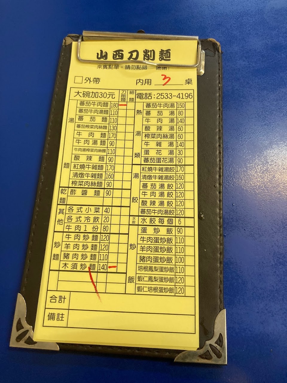木鬚刀削麵很Q很大份,蕃茄牛肉麵的湯也非常好喝,牛肉也不卡牙,會知道是因為外送平台叫過5次左右,今天特地從別區跑到大直買,櫃檯人員很親切,下次回訪會嘗試內用。