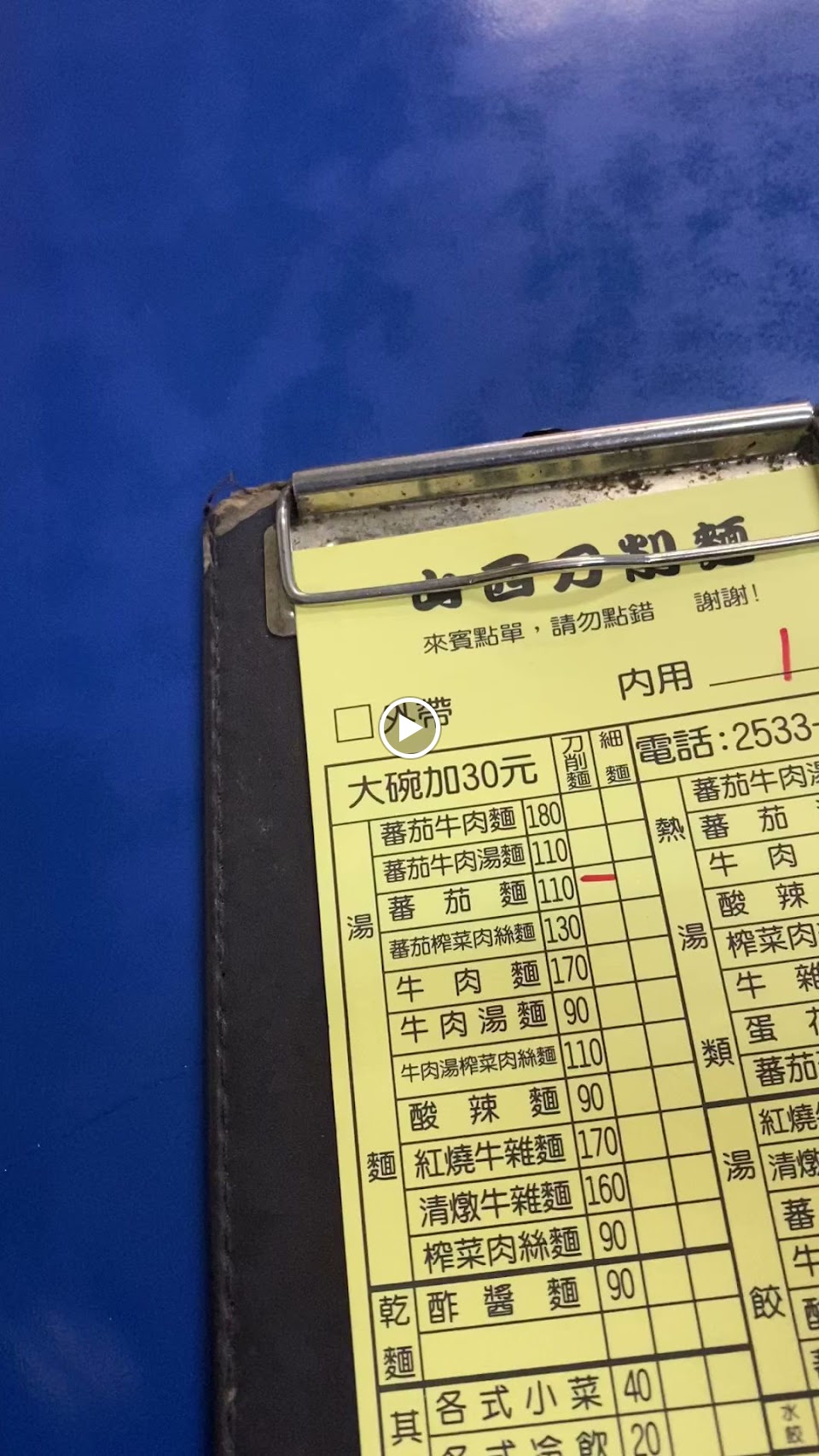 牆上的菜單跟紙本不一樣,少了木須炒麵,點完牛肉麵看了隔壁桌的木須炒麵有點後悔。