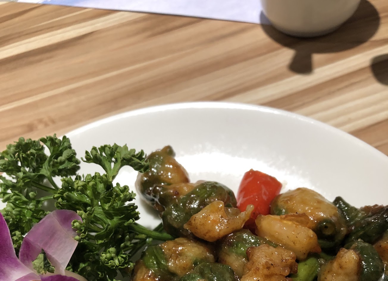 豆釀百花:菜豆加蝦漿。菜豆的脆口加上Q彈蝦漿,很驚喜的口感,特別是乾辣椒裡面也費心鑲入蟹肉,千萬別置之不理。真的是很用心的創意料理!