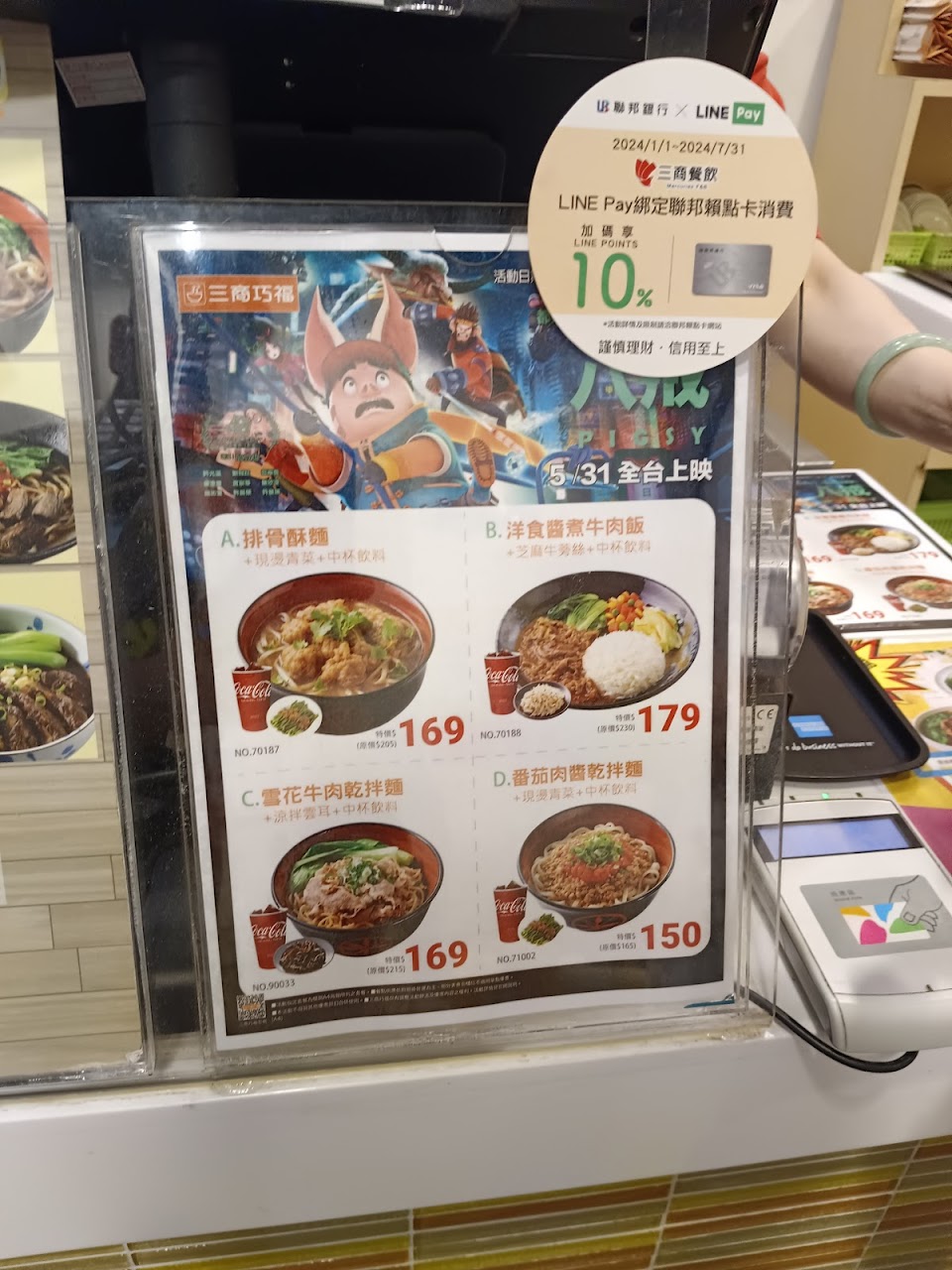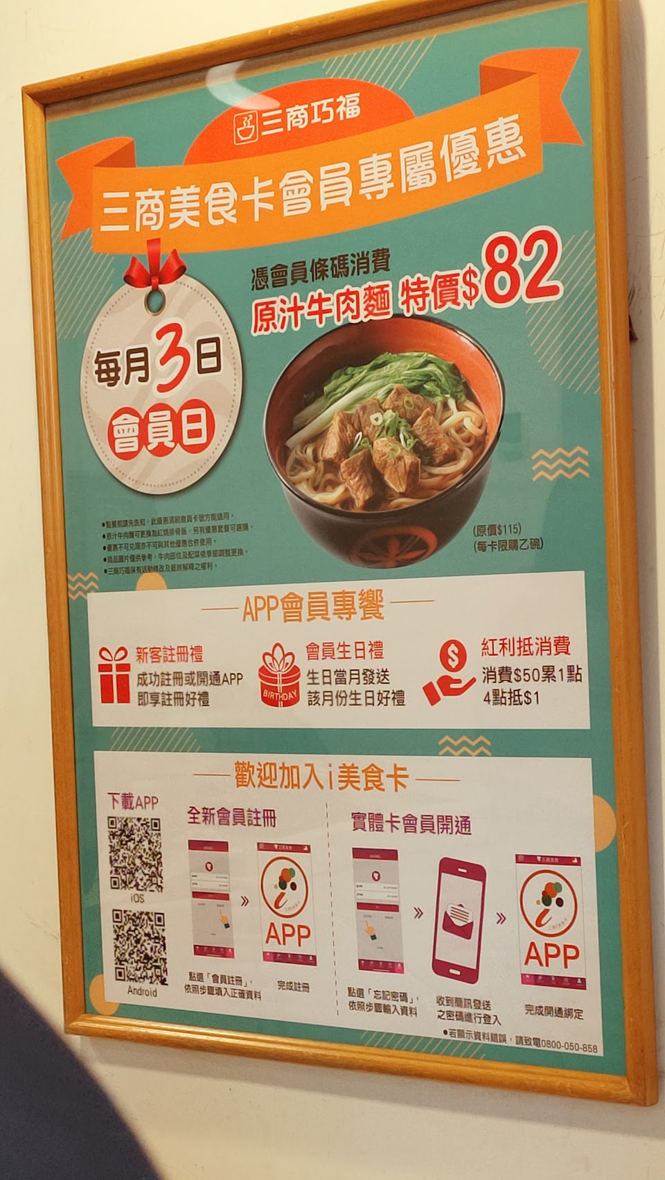 近期至今來到這間門市消費應有五次,地點位於捷運民權西路站附近不遠處,店內坪數不大,但用餐時間總是很多人,若有下載三商巧福APP,即可積點,達可開始折抵的點數時,可以以點數折抵部份消費金額,只是要消費每滿$50才能積1點,發覺店家聰明心機,看商品套餐定價則可知,價格大多在$150以下,亦即$100~149價格區間,消費者只能到2點,或是像前不久推出的5/24日前,原汁牛肉麵$95,少了$5就只能累積到1點,真的是[定價&積點]的小心機!!
