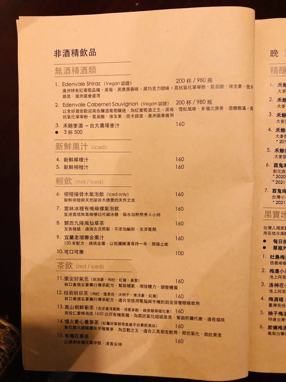 菜單食物兩頁但是軟飲酒類共有四頁