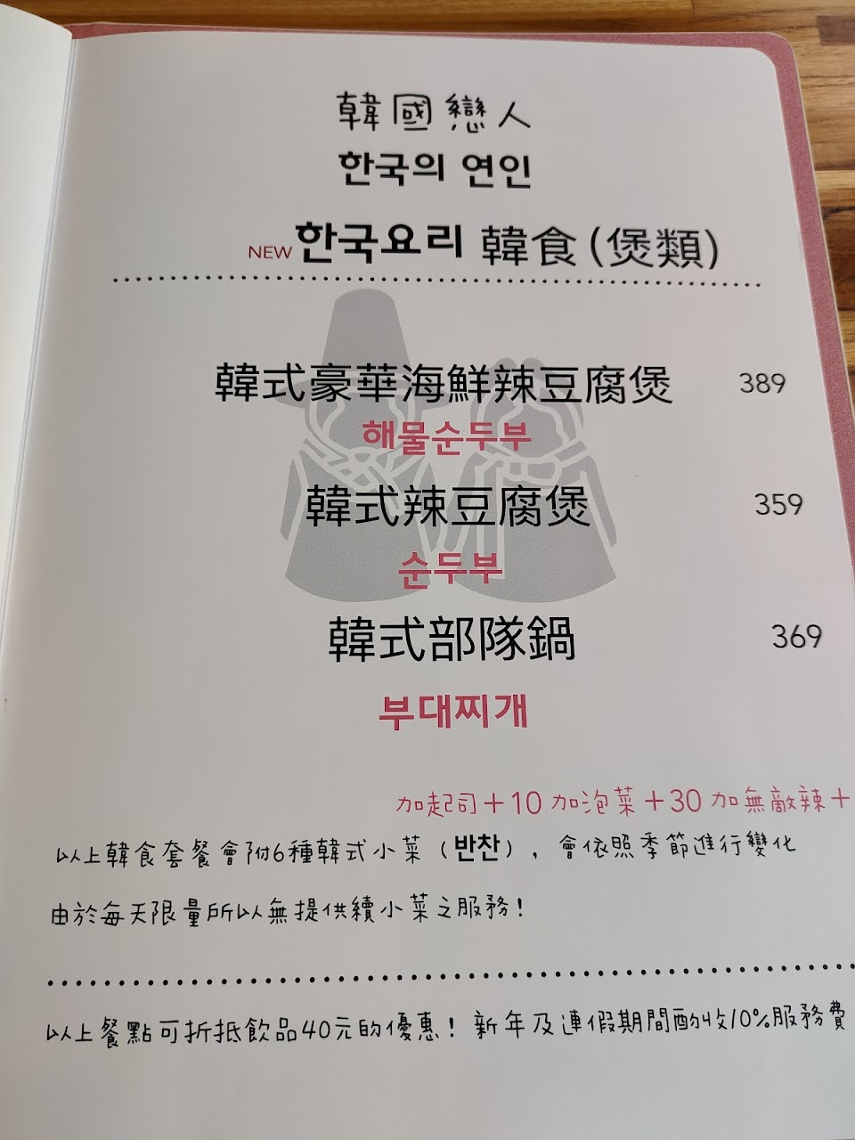 環境舒服,戶外也是很好的拍照打卡地 韓式料理的餐點選擇不少 我們當天吃了… ▪韓式豪華海鮮辣豆腐煲 $389 ▪韓式宮廷牛肉 $389 ▪韓式粉紅玫瑰辣炒年糕 $180 ▪蒜香白酒蛤蠣 $289 ▪咖啡拿鐵 $100 ▪蜂蜜柚茶 $120