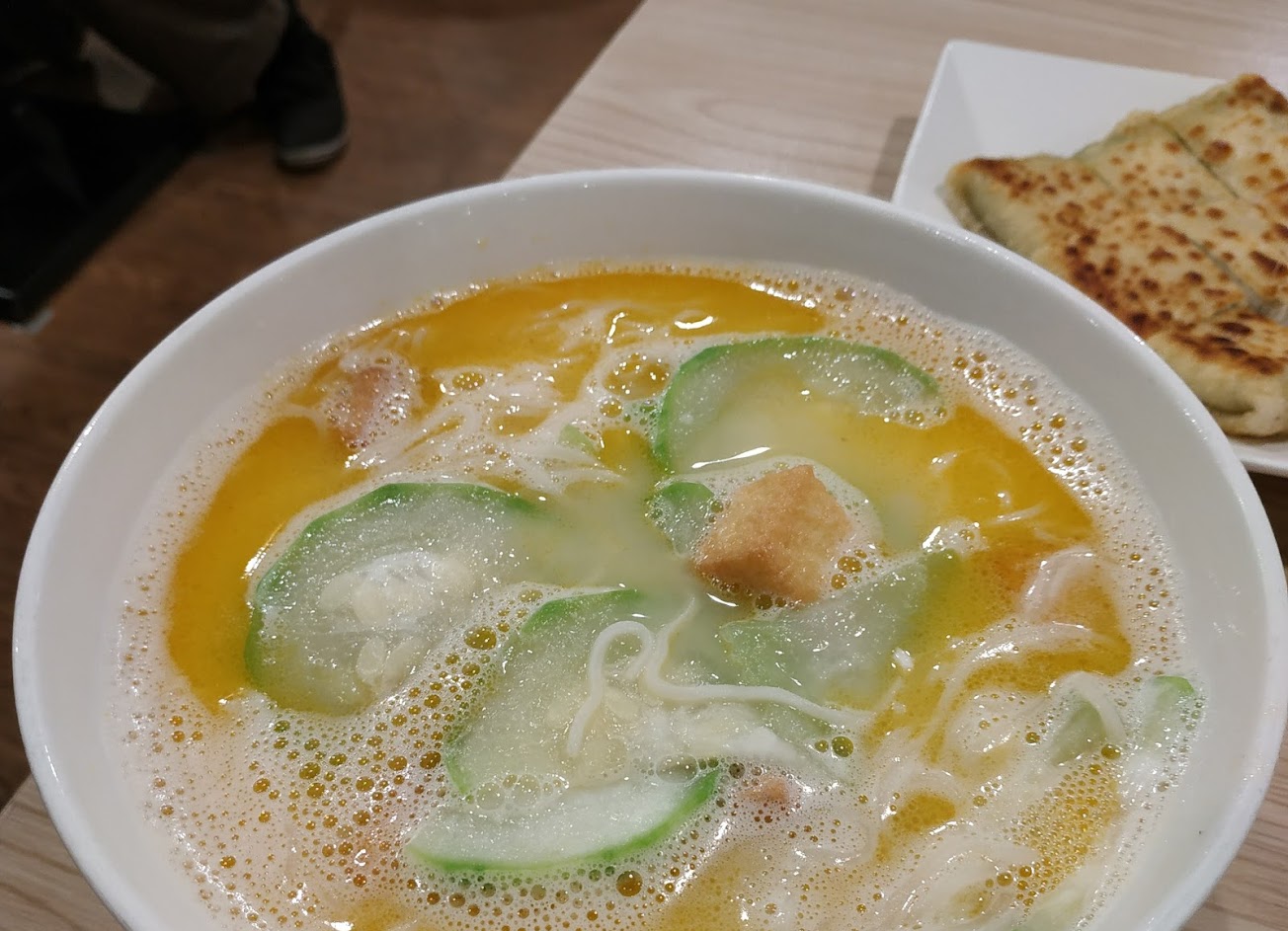 鹹蛋絲瓜麵線,口味協調,湯也可以喝完,要早點吃完不然湯會被麵線吸光。