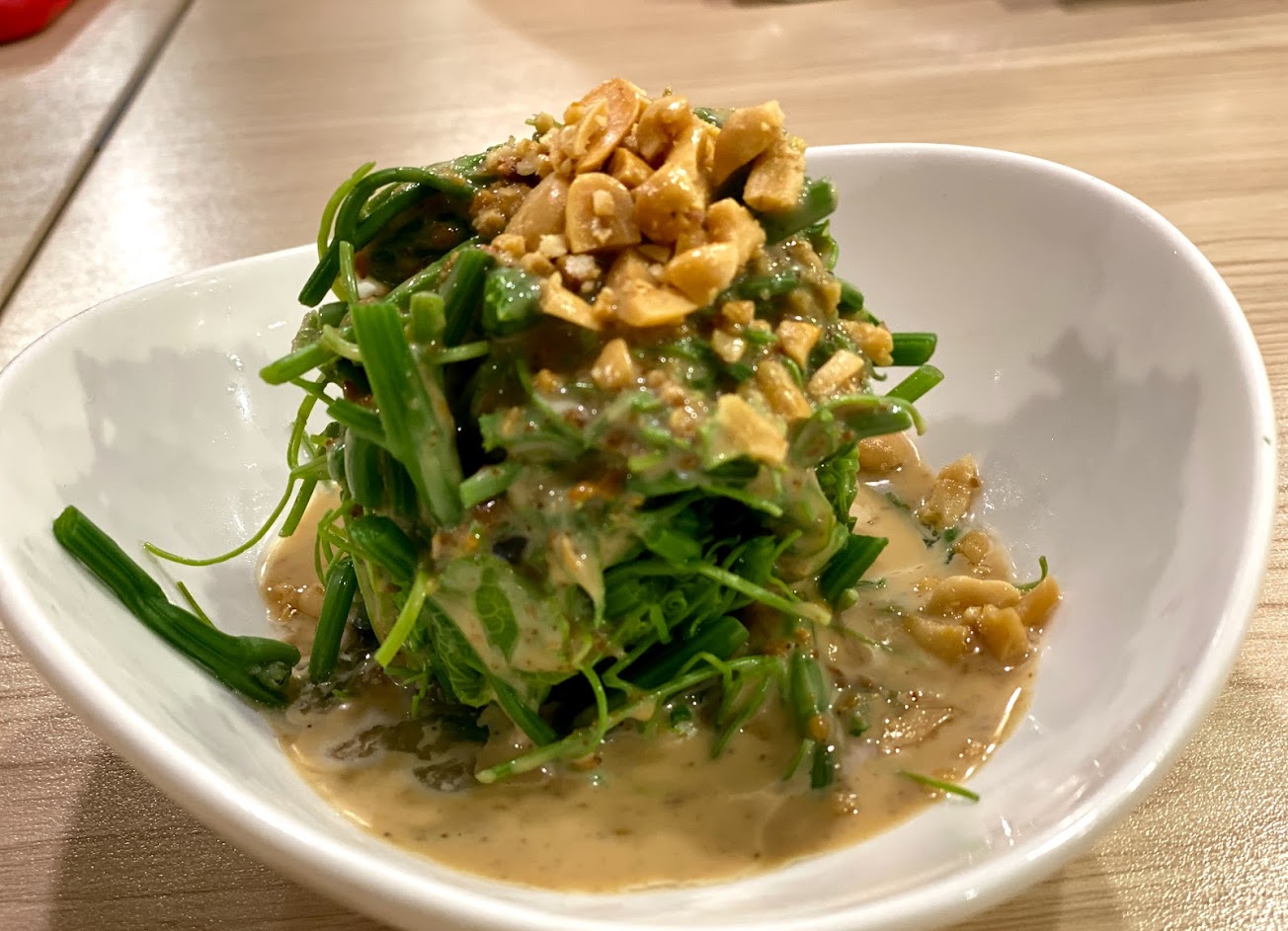 餐點部分—水蓮雲吞還不錯,味道有麻不太辣,內餡可吃到花枝及蝦仁本人,炒水蓮就一般般,不太難吃,鹹蛋絲瓜麵線一開始吃還不錯,味道蠻新奇,胡麻龍鬚就是可以想像到的味道,而花生豆腐❌整體上只有口感沒有,跟在美濃吃到的完全有落差,個人覺得就是不知道在吃什麼⋯可惜了