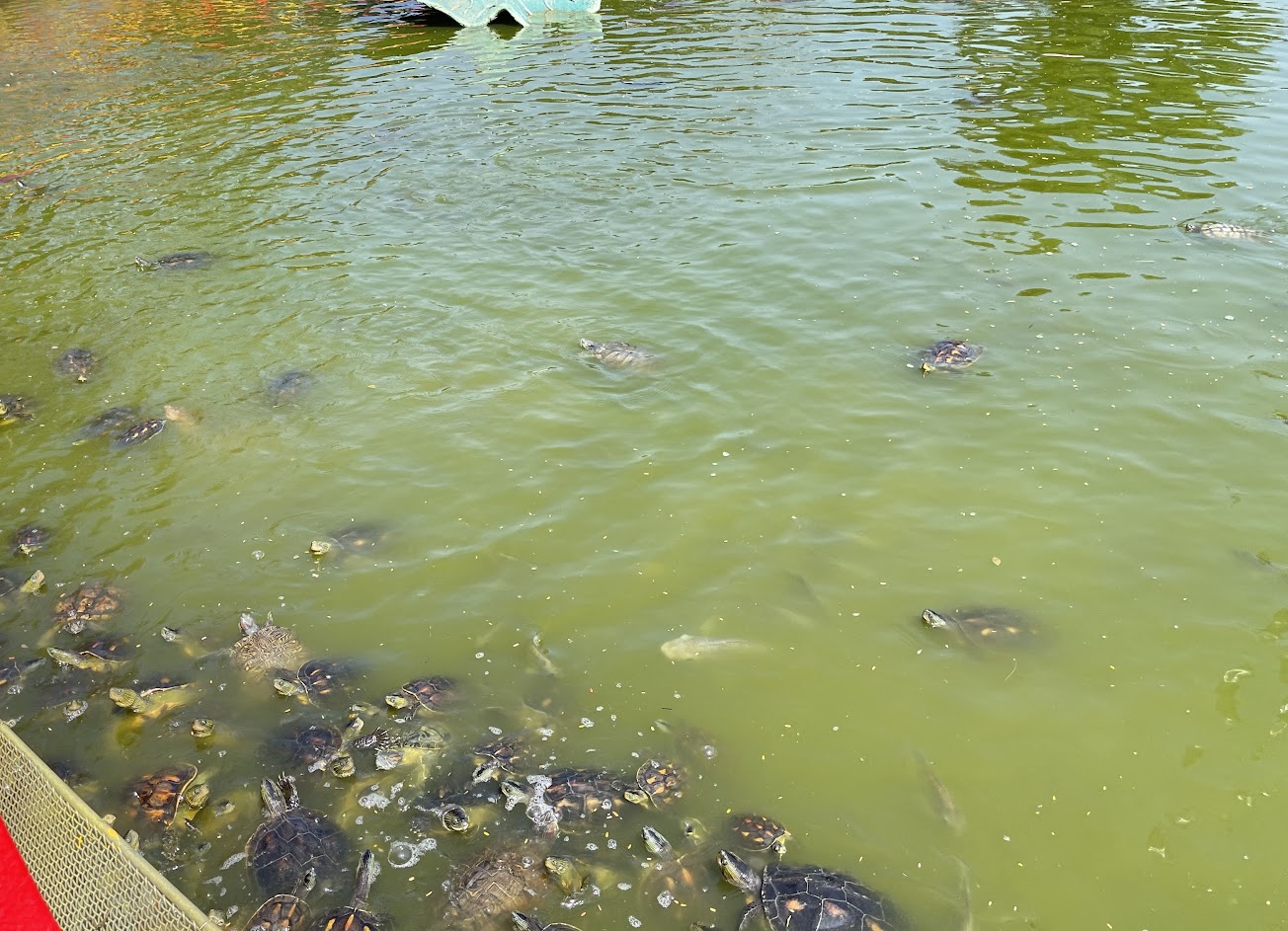 放生池爆多烏龜,購買魚飼料後不要一個地方餵完,沿路還有多處可餵食。