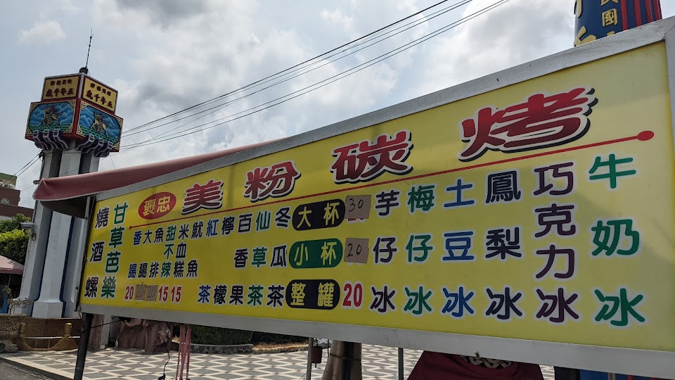 馬鳴山公園的在地美食 過年的時候更是大排長龍 絡繹不絕 人潮超級多的 而老闆娘人做生意也很老實不會看你是外地來的就亂喊價 所以回購率和老客戶都很多 。每次來這個公園 都會來這攤美粉碳烤 買一下古早味的在地美食。米血烤的香Q彈牙 大腸包小腸 一口咬下去 香氣四溢 燒酒螺 分了大辣 中辣 小辣 好吃又不死鹹 烤魷魚 每個部位 烤起來 再搭配上獨家的香料 真是又香又有嚼勁 飲料方面 有紅茶 百香果 檸檬汁 青草茶 其中我最愛檸檬汁 酸甜的口感 夏天喝個兩杯也不為過 冰淇淋口味也是古早味的 這種小時後賣的冰淇淇 真是越來越難看見了 還好馬鳴山這裡就還有一攤 可以讓人有回到了小時候的感覺 總而言之 這攤就像是台時光機器一樣 讓大家都可以 回到過去 真是回味無窮阿!