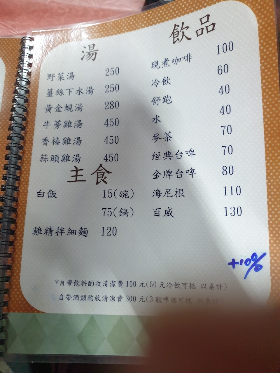 事實上當天我和家人到現場其實已經八點半了,原本八點就不收客人了(九點關店),因為當天有下了場雨,我和家人是騎機車去的,淋了一身,老闆的女兒看我們風塵僕僕二話不說馬上幫我們點餐,兩個人點了一隻全雞,三道菜一個麵一碗飯,吃不完的帶走,這樣才1015元。