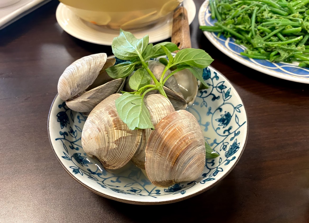 一鍋高湯,一盤菜,幾棵扇貝跟淡菜,完成了一道鮮美去膩的湯,因為滷肉飯可能會有點油膩,這時候這到湯與單純的燙青菜,整個就非常搭,清爽的青菜,與鮮美的貝類,單純的湯頭,完整了舒服的感覺