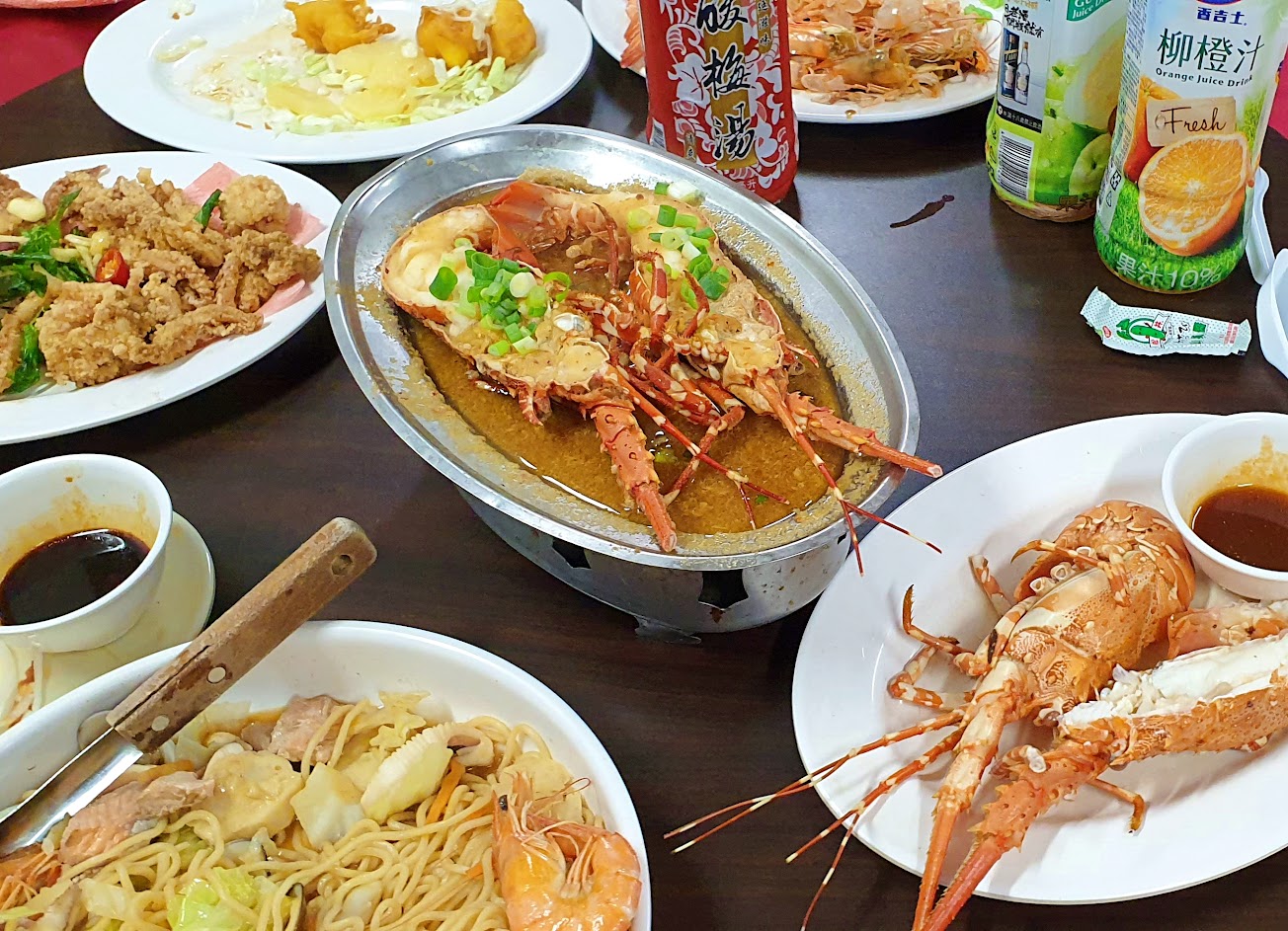 餐點大概除了龍蝦口味還可以,炒麵沒味道、蒸魚也不新鮮(魚肉夾了就碎),水蓮很老、炒花枝都是洋蔥⋯⋯⋯