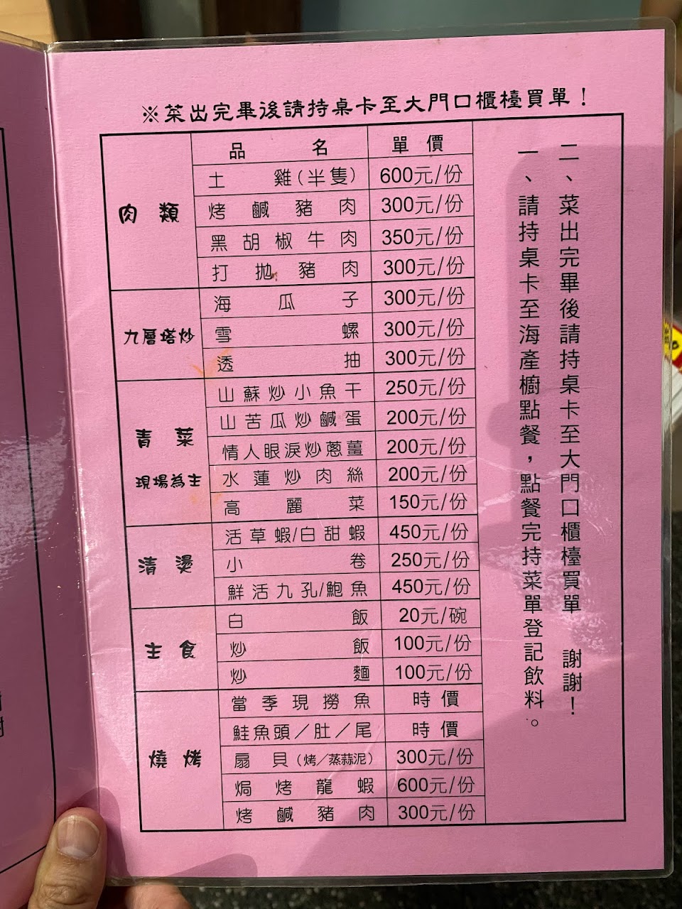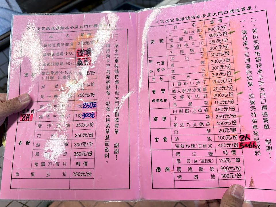 點餐處的開放式冷凍櫃有當天的現炒肉類跟魚種、特價商品,上面都有清楚標價;左邊有活海鮮(時價)、也都會標示;點餐人員會依據你的人數建議要點大份或小份餐點;點完餐也會再次確認品項。