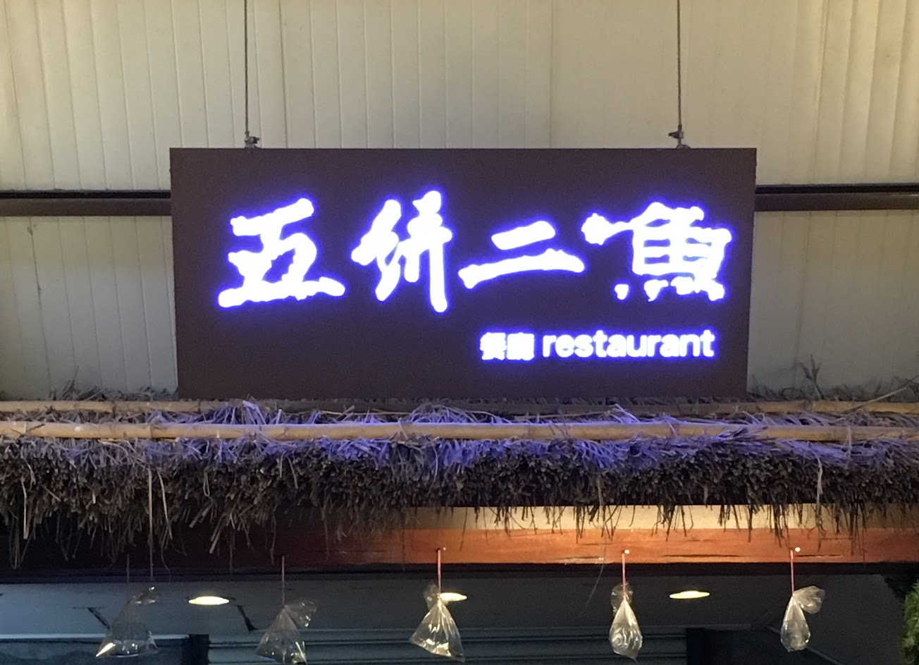 以黃金蜆、吳郭魚等養殖類為主題的餐廳,很適合親子遊。五餅二魚是聖經故事,餐廳播放的音樂有些是基督教的聖樂,老闆可能是基督徒。