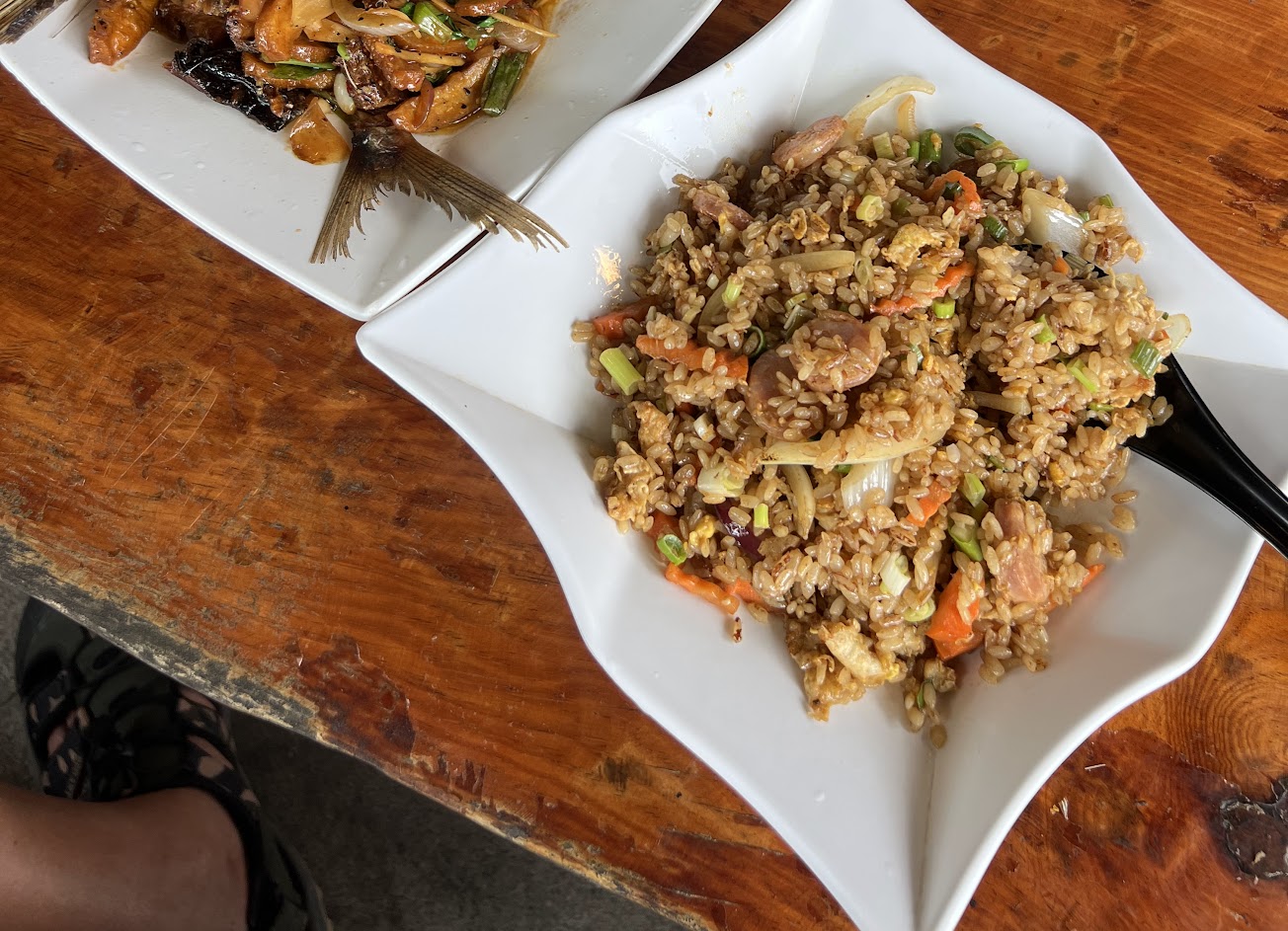 店內的部落小炒就是用煙燻飛魚乾為料加豆干、蒜、九層塔等炒成客家小炒似的菜,來上一盤,再加飛魚卵炒飯。