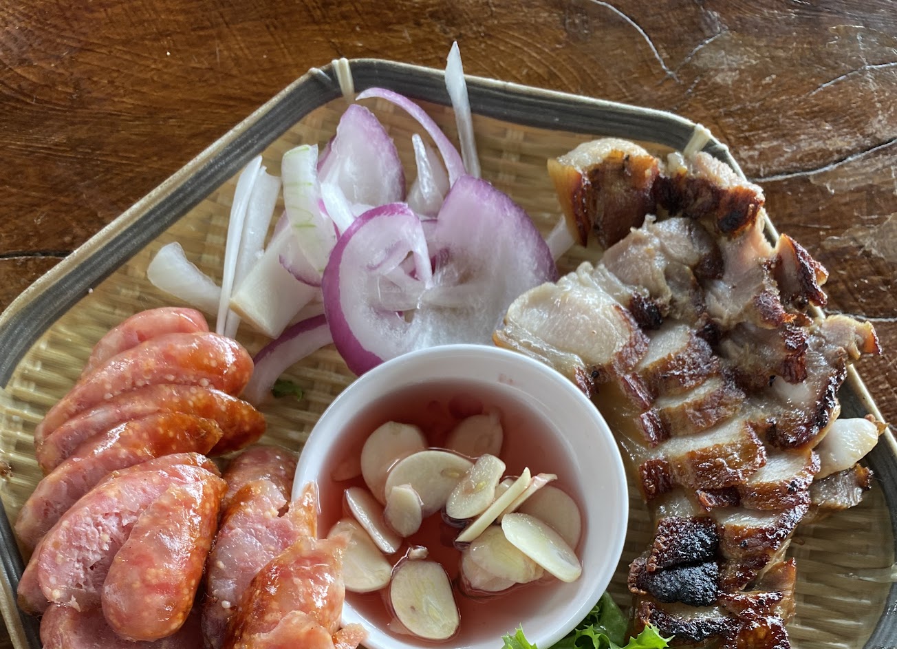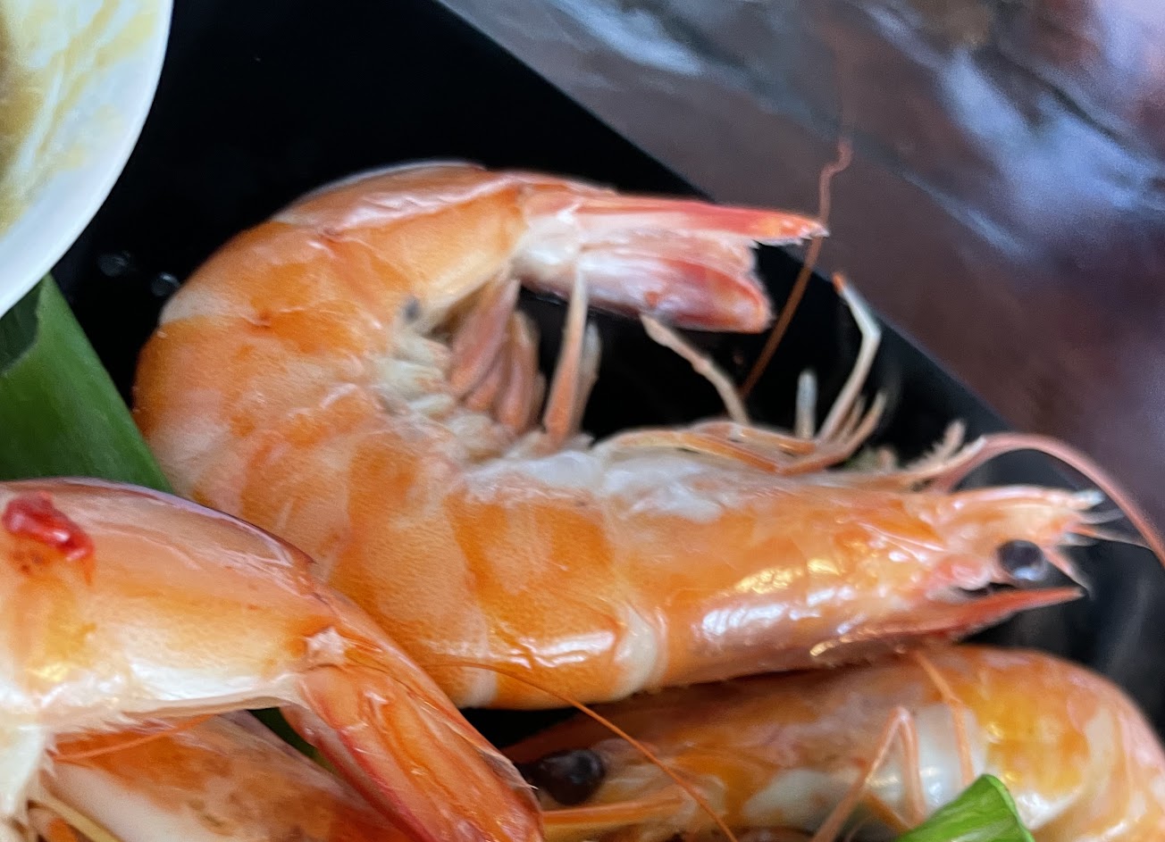 烤鹹豬肉與飛魚卵香腸 川燙 白蝦 竹筒蝦湯 清蒸魚