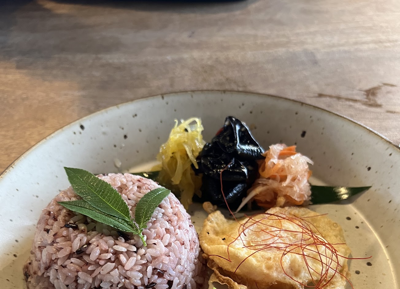 餐點部分 用紫米飯很健康但是偏硬 醬料口味不錯 偏溼 不容易膩 辣度雖然菜單上寫兩根辣椒 但我覺得算小辣 舒芙蕾 口感中等不會太濕 也是這裡的特色餐點之一