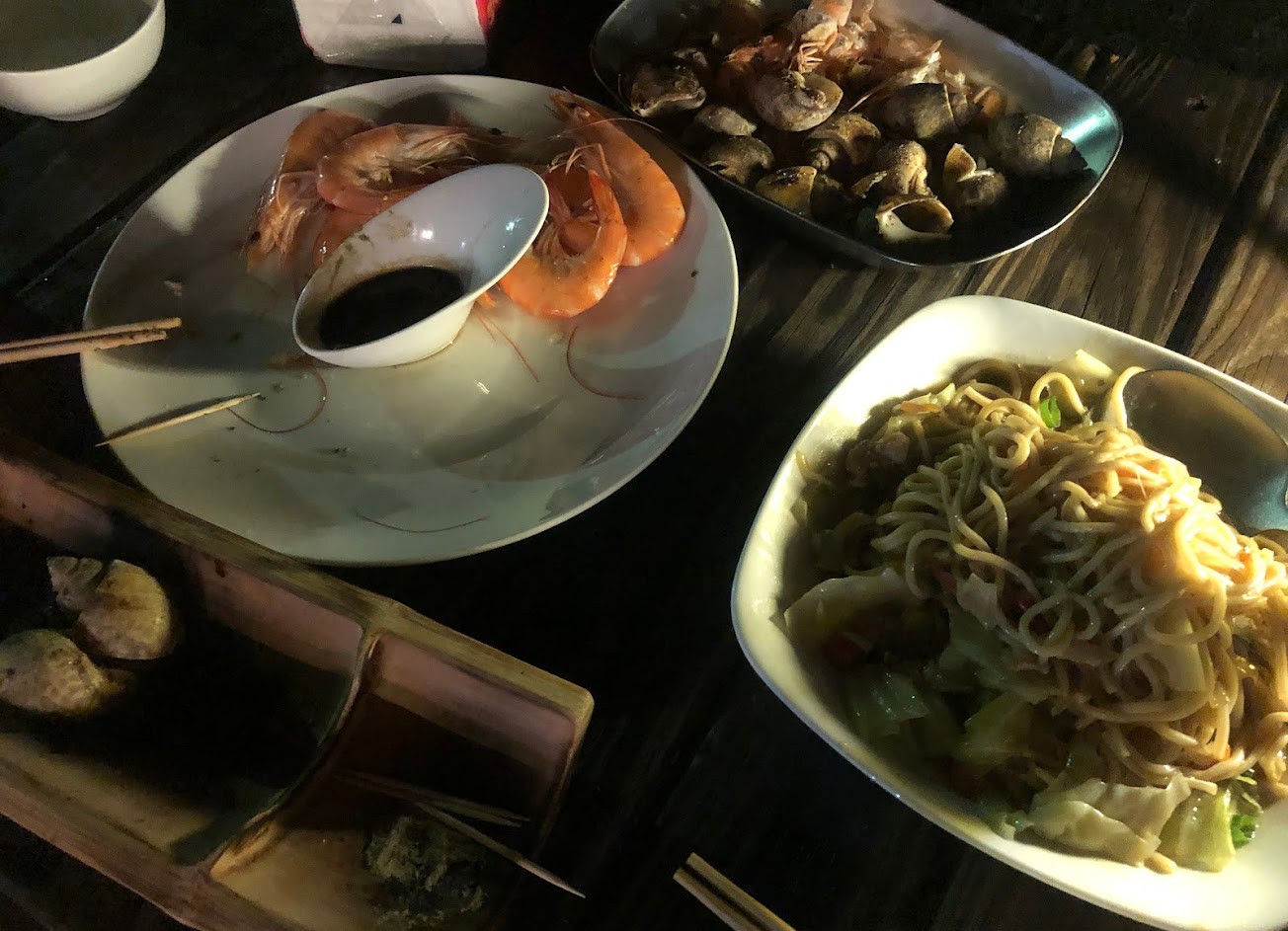 價格稍稍高,但食材很新鮮。點了燙蝦、炒赤嘴、炒麵及烤五花肉,表現都挺不錯的。但赤嘴與五花肉的調味稍微偏鹹了一點,可能比較適合拿來當下酒菜。