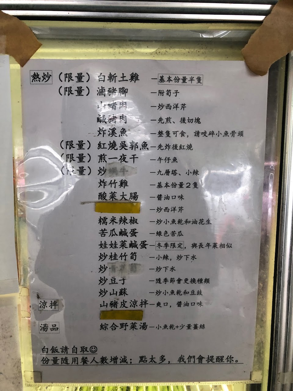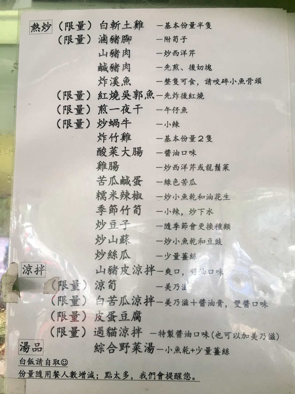 菜單沒有標價,四菜一湯約950,來的時候肉類只剩一夜干與鹹豬肉,點了鹹豬肉,意外好吃!搭配的醬汁完全解掉豬肉肥油的油膩感,除了有名的雞肉也可以試試看。