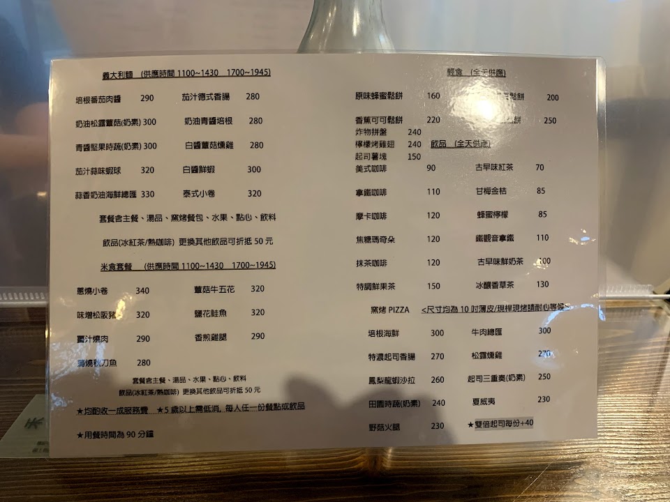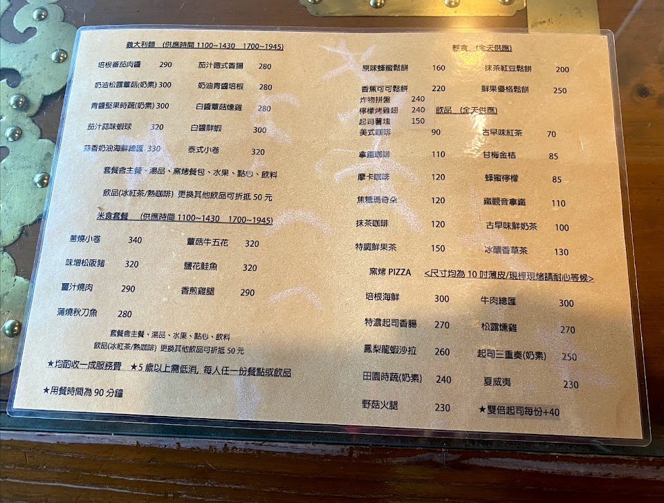 舒適的內用環境,餐點額外收一成收服務費,餐廳人手內場只有兩位,動作與上餐速度並不是很快,如果趕時間者不適合在這用餐。餐點口味屬於清單都不錯,天然沒有太多負擔,適合攜帶長輩。義大利麵類套餐是現煮的,簡餐類相較普通,部分品項跟火鍋單價350元對比用料會覺得單價略高。披薩有龍眼木的香氣,適合嚐鮮。為附近少數用餐環境較為舒適有特色的餐廳,可以偶爾帶外地朋友來找日式老宅吃飯的點,人氣很旺,週末或連假期間客人也很多,建議都要提前預約,才不會撲空。