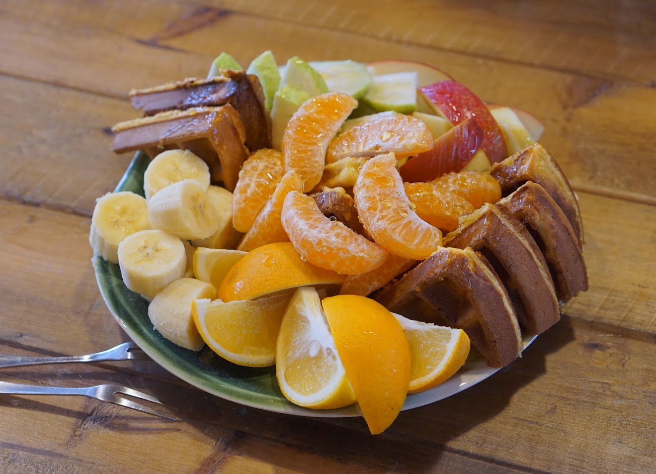 水果鬆餅很大盤,鬆餅吃完水果帶走路上邊開車邊吃