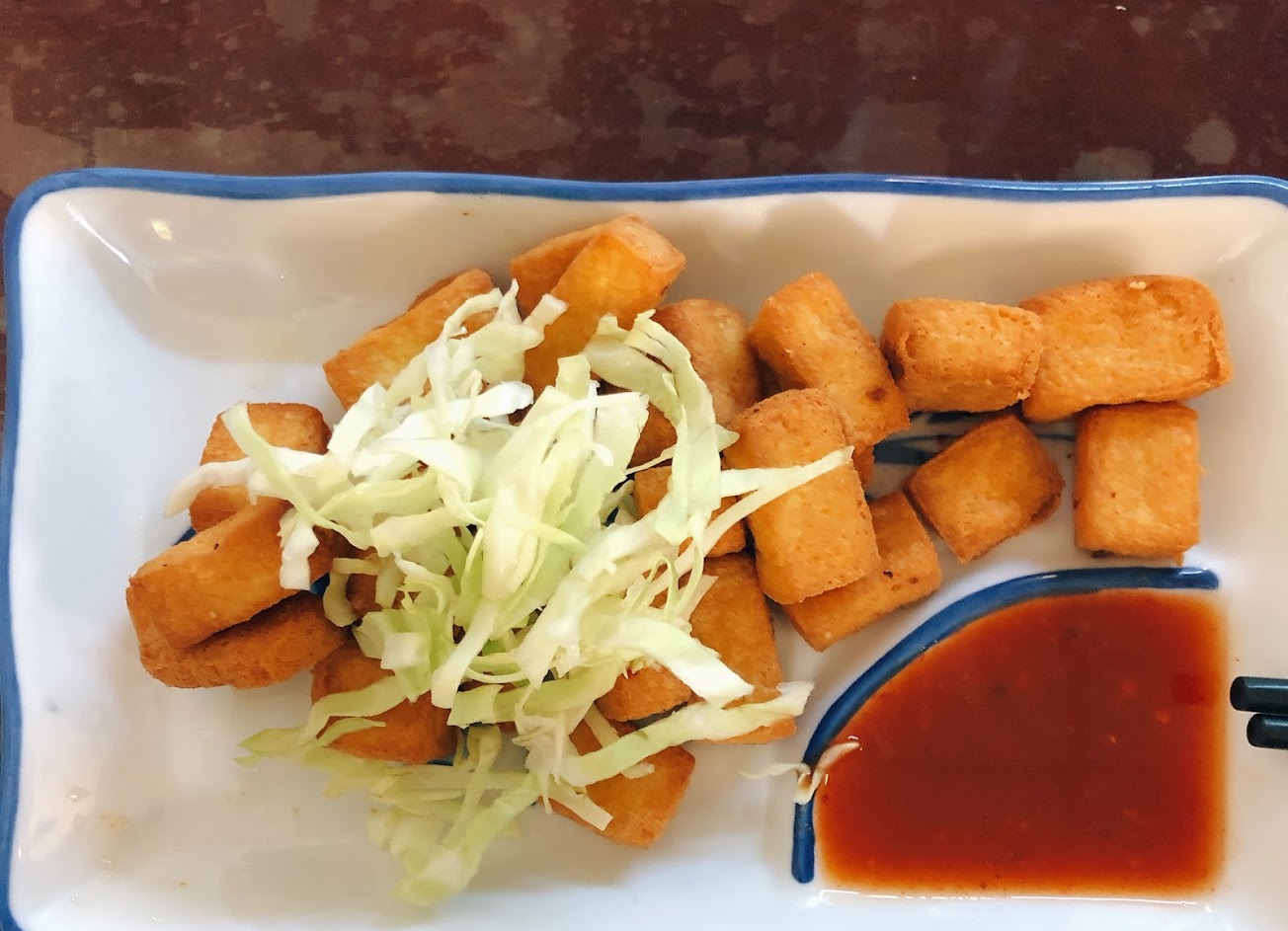 豆腐炸的外皮酥脆裡面軟嫩,很好吃,不過醬汁跟泰式雞排的醬一樣,有一點點小失望。