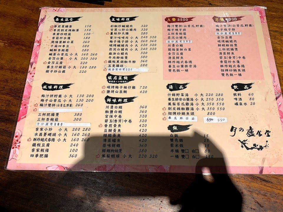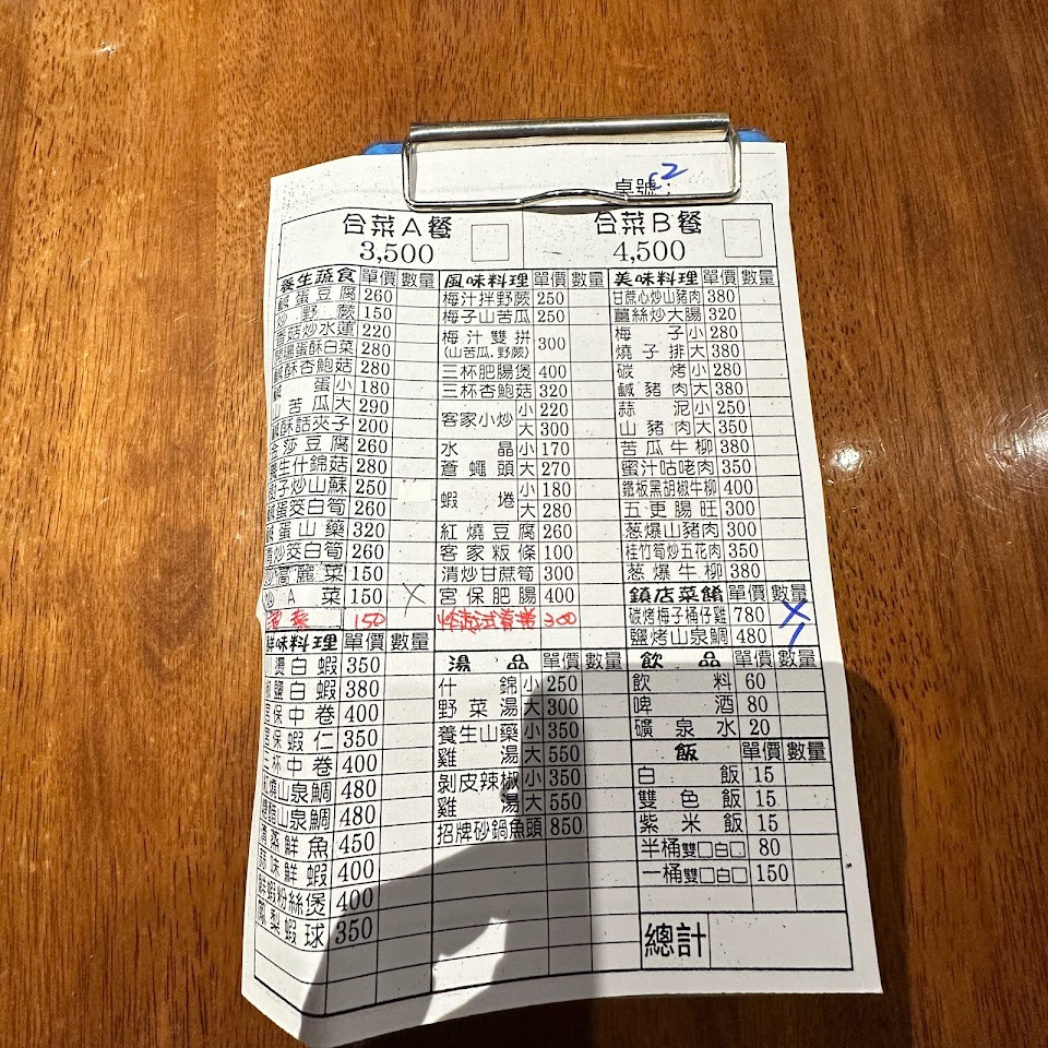 山藥排骨湯 鮮蝦粉絲煲 碳烤梅子桶仔雞 客家小炒 金沙山藥 三杯中卷 梅子雙拼 剝皮辣椒雞湯 梅汁烤雞